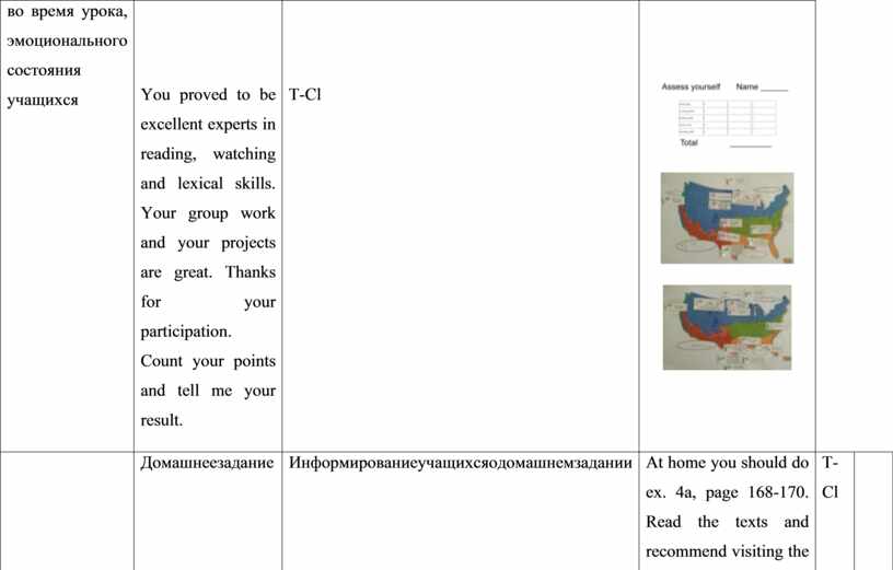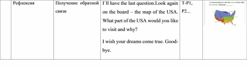 I`ll have the last question.Look again on the board – the map of the USA. What part of the USA would you like to visit and why? I wish your dreams come true. Good-bye. |