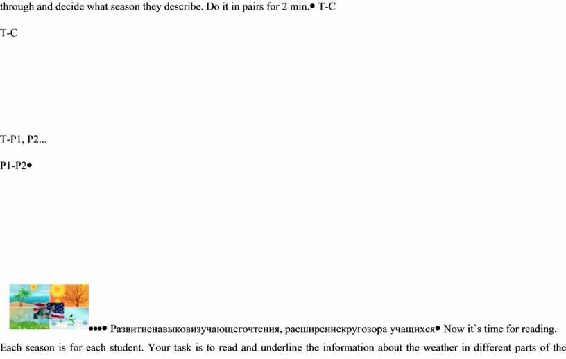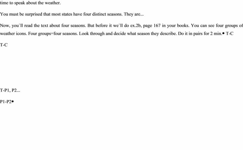 Thank you. Let`s continue. We`ve already discussed the climate of the USA, now it`s time to speak about the weather. You must be surprised that most states have four distinct seasons. They are... Now, you`ll read the text about four seasons. But before it we`ll do ex.2b, page 167 in your books. You can see four groups of weather icons. Four groups=four seasons. Look through and decide what season they describe. Do it in pairs for 2 min. |