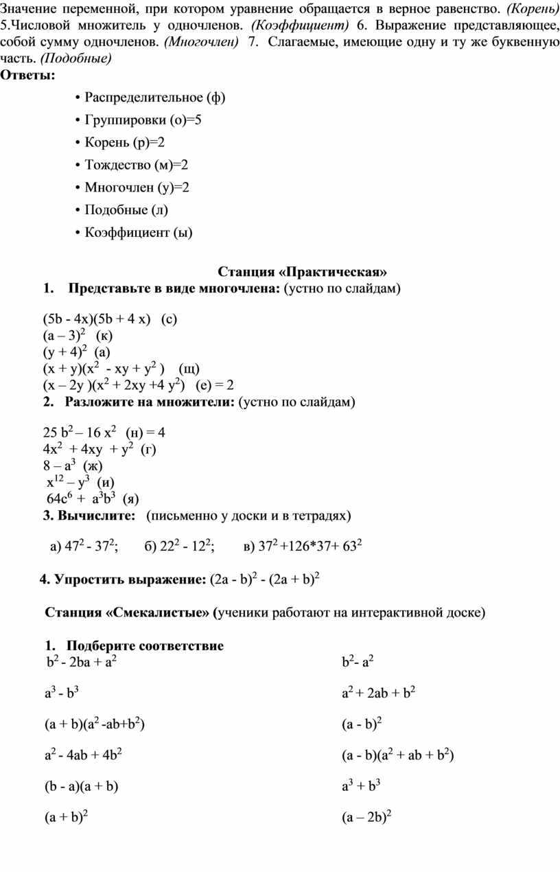 на многочлен. (Распределительное) 2. Способ разложения многочлена на множители. (Группировки) 3.Равенство верное при любых значениях переменной. (Тождество) 4. Значение переменной, при котором уравнение обращается в верное равенство. (Корень) 5.Числовой множитель у одночленов. (Коэффициент) 6. Выражение представляющее, собой сумму одночленов. (Многочлен) 7. Слагаемые, имеющие одну и ту же буквенную часть. (Подобные)