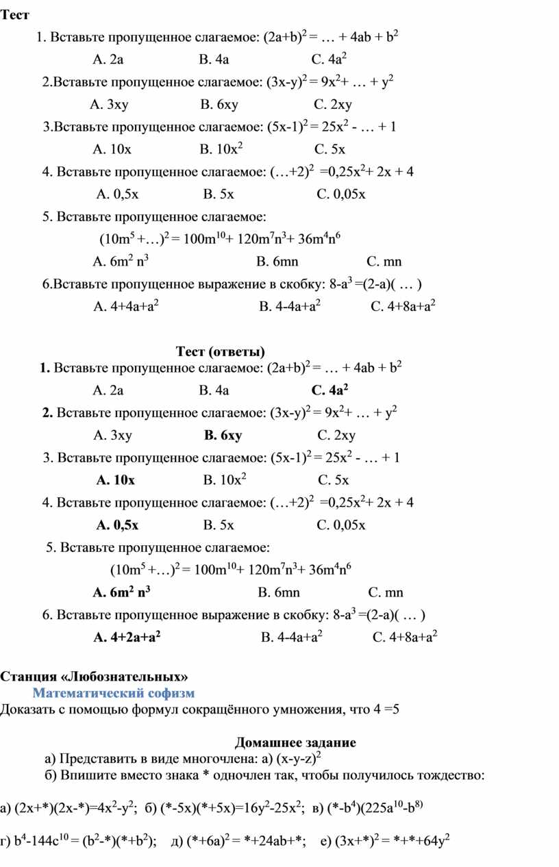 1. Вставьте пропущенное слагаемое: (2a+b)2 = … + 4ab + b2