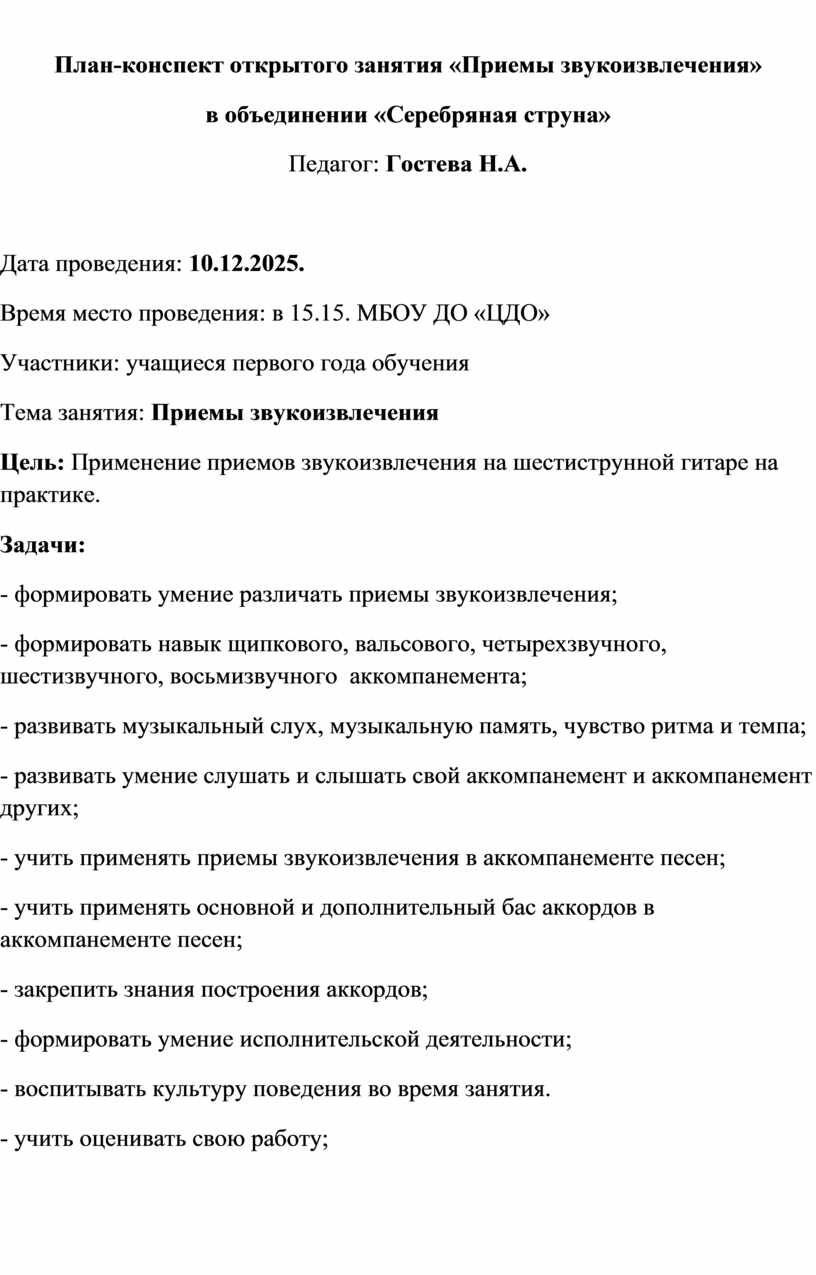 План-конспект открытого занятия «Приемы звукоизвлечения»