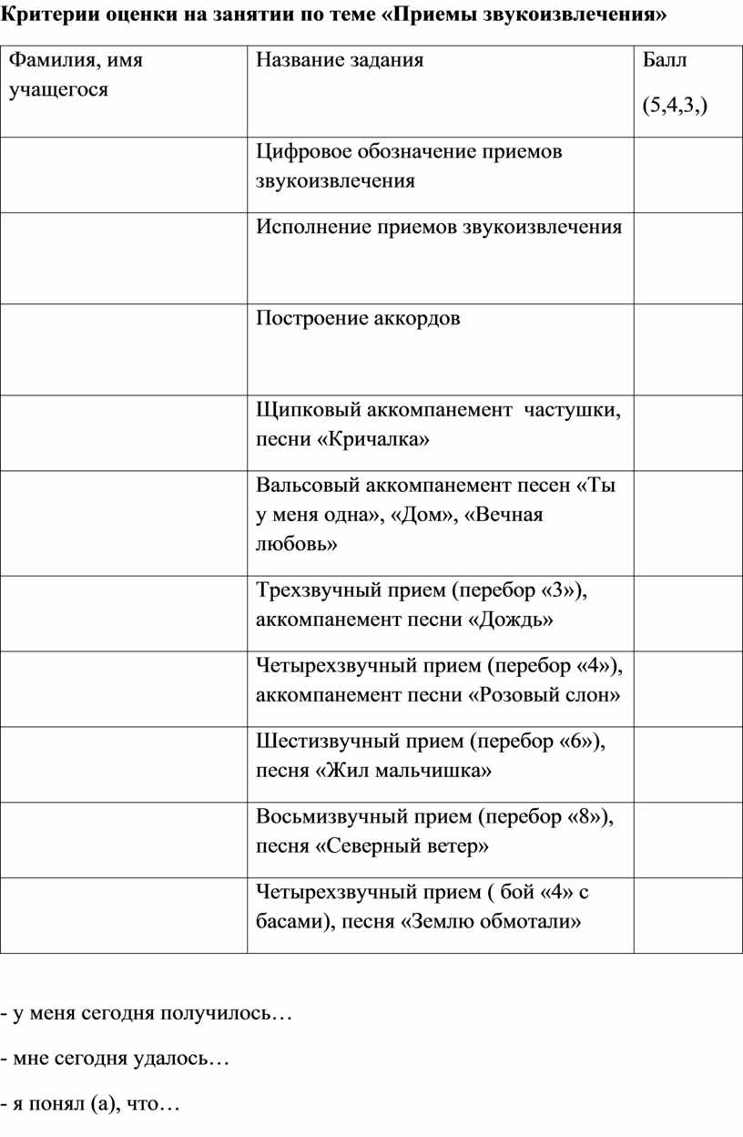 Критерии оценки на занятии по теме «Приемы звукоизвлечения»