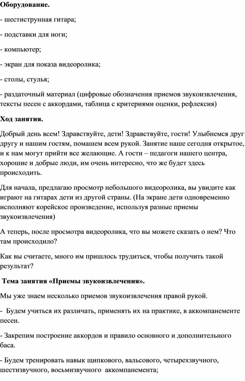 - раздаточный материал (цифровые обозначения приемов звукоизвлечения, тексты песен с аккордами, таблица с критериями оценки, рефлексия)