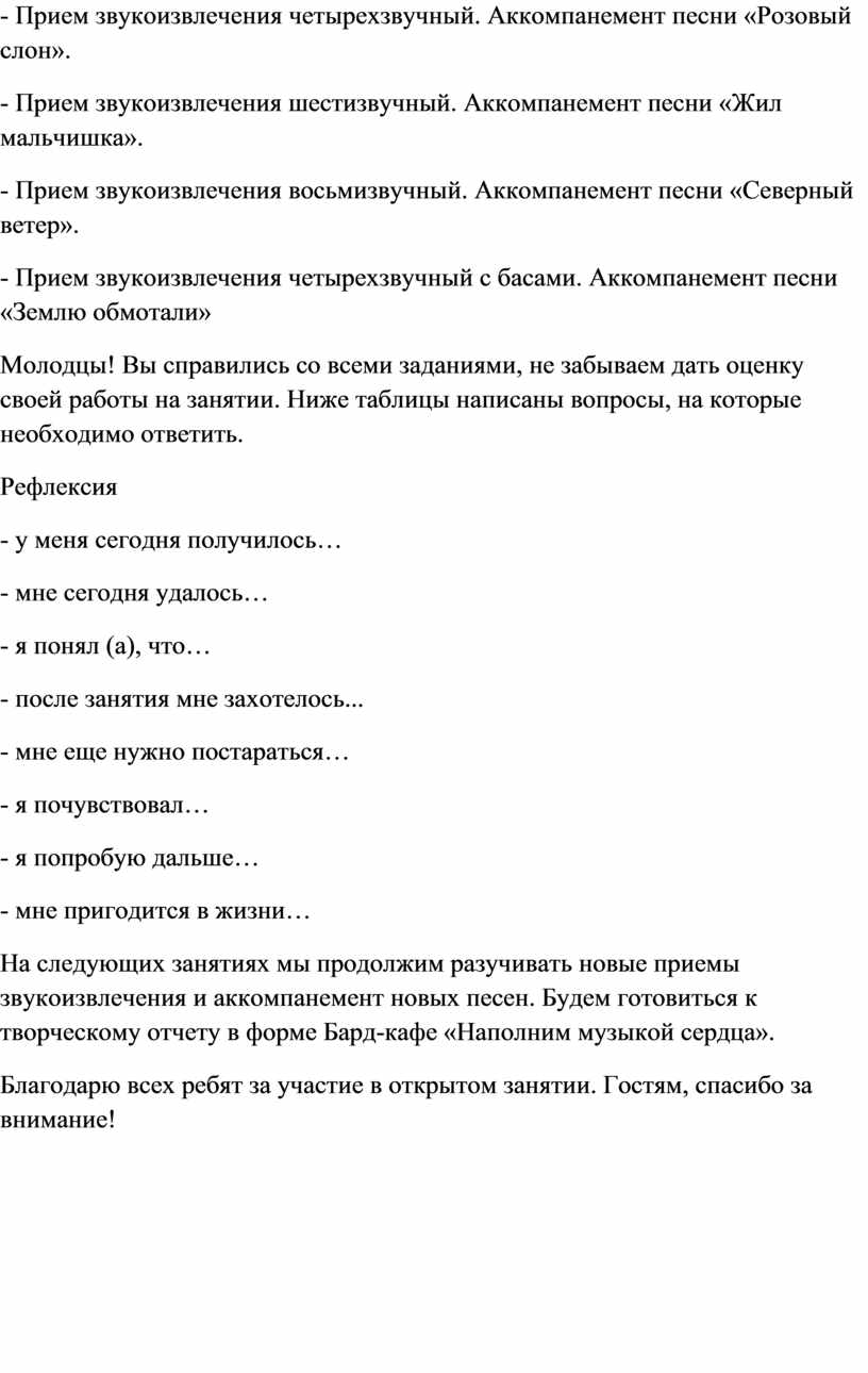 На следующих занятиях мы продолжим разучивать новые приемы звукоизвлечения и аккомпанемент новых песен. Будем готовиться к творческому отчету в форме Бард-кафе «Наполним музыкой сердца».