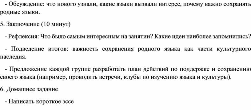 - Обсуждение: что нового узнали, какие языки вызвали интерес, почему важно сохранять родные языки.
