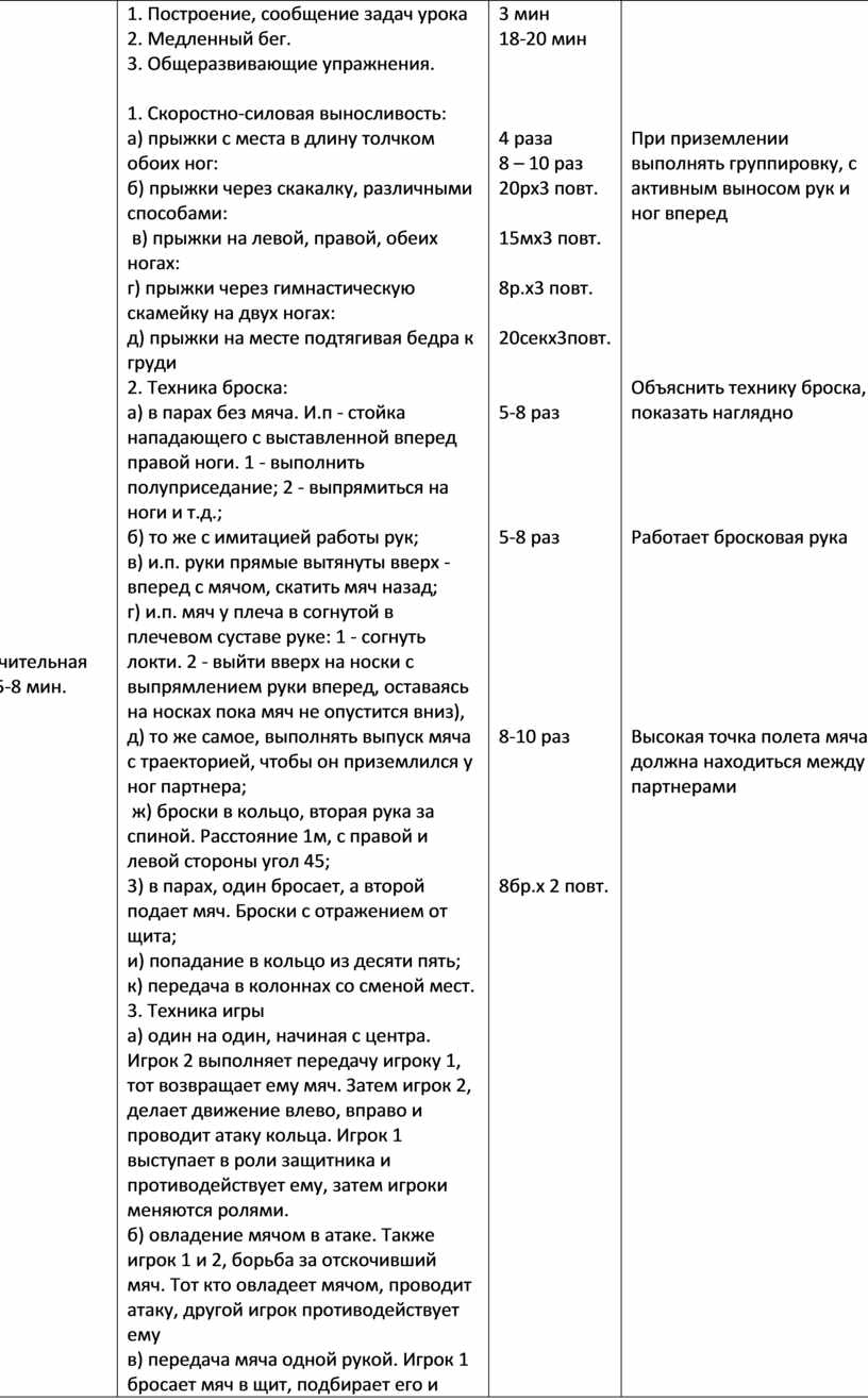 1. Скоростно-силовая выносливость: а) прыжки с места в длину толчком обоих ног: б) прыжки через скакалку, различными способами: в) прыжки на левой, правой, обеих ногах: г) прыжки через гимнастическую скамейку на двух ногах: д) прыжки на месте подтягивая бедра к груди 2. Техника броска: а) в парах без мяча. И.п - стойка нападающего с выставленной вперед правой ноги. 1 - выполнить полуприседание; 2 - выпрямиться на ноги и т.д.; б) то же с имитацией работы рук; в) и.п. руки прямые вытянуты вверх - вперед с мячом, скатить мяч назад; г) и.п. мяч у плеча в согнутой в плечевом суставе руке: 1 - согнуть локти. 2 - выйти вверх на носки с выпрямлением руки вперед, оставаясь на носках пока мяч не опустится вниз), д) то же самое, выполнять выпуск мяча с траекторией, чтобы он приземлился у ног партнера; ж) броски в кольцо, вторая рука за спиной. Расстояние 1м, с правой и левой стороны угол 45; 3) в парах, один бросает, а второй подает мяч. Броски с отражением от щита; и) попадание в кольцо из десяти пять; к) передача в колоннах со сменой мест. 3. Техника игры а) один на один, начиная с центра. Игрок 2 выполняет передачу игроку 1, тот возвращает ему мяч. Затем игрок 2, делает движение влево, вправо и проводит атаку кольца. Игрок 1 выступает в роли защитника и противодействует ему, затем игроки меняются ролями. б) овладение мячом в атаке. Также игрок 1 и 2, борьба за отскочивший мяч. Тот кто овладеет мячом, проводит атаку, другой игрок противодействует ему в) передача мяча одной рукой. Игрок 1 бросает мяч в щит, подбирает его и выполняет передачу от плеча одной рукой игроку 3, который отдает мяч набравшему скорость игроку 2. Получив мяч, игрок 2 атакует противоположное кольцо и быстро устремляется к другому кольцу. Игрок 3, подобрав мяч под кольцом, отдает его набравшему скорость игроку 2, который, получив мяч, атакует кольцо; г) передача мяча через поле одной рукой; д) передача мяча через поле двумя руками; е) один игрок в защите, двое в нападении, используют передачу мяча между собой, затем двое в защите три игрока в нападении, и наоборот. 2 х 1 и 3 x 2; ж) игра 3 х 3, по 4 атаки 1. Гимнастика на расслабление 2. Подведение итогов урока |