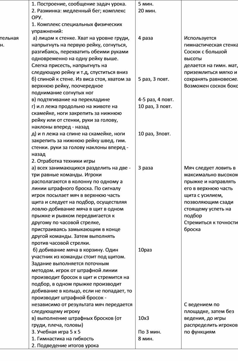 1. Построение, сообщение задач урока. 2. Разминка: медленный бег; комплекс ОРУ. 1. Комплекс специальных физических упражнений: а) лицом к стенке. Хват на уровне груди, напрыгнуть на первую рейку, согнуться, разгибаясь, перехватить обеими руками одновременно на одну рейку выше. Слегка присесть, напрыгнуть на следующую рейку и т.д, спуститься вниз б) спиной к стене. Из виса стоя, хватом за верхнюю рейку, поочередное поднимание согнутых ног в) подтягивание на перекладине г) и.п лежа продольно на животе на скамейке, ноги закрепить за нижнюю рейку или от стенки, руки за голову, наклоны вперед - назад д) и п лежа на спине на скамейке, ноги закрепить за нижнюю рейку швед. гим. стенки. руки за голову наклоны вперед - назад 2. Отработка техники игры а) всех занимающихся разделить на две - три равные команды. Игроки располагаются в колонну по одному а линии штрафного броска. По сигналу игрок посылает мяч в верхнюю часть щита и следует на подбор, осуществляя ловлю-добивание мяча в щит в одном прыжке и рывком передвигается к другому по часовой стрелке, пристраиваясь замыкающим в конце другой команды. Затем выполнять против часовой стрелки. б) добивание мяча в корзину. Один участник из команды стоит под щитом. Задание выполняется поточным методом. игрок от штрафной линии производит бросок в щит и стремится на подбор, в одном прыжке производит добивание в кольцо, если не попадает, то производит штрафной бросок - независимо от результата мяч передается следующему игроку в) выполнение штрафных бросков (от груди, плеча, головы) 3. Учебная игра 5 х 5 1. Гимнастика на гибкость 2. Подведение итогов урока |