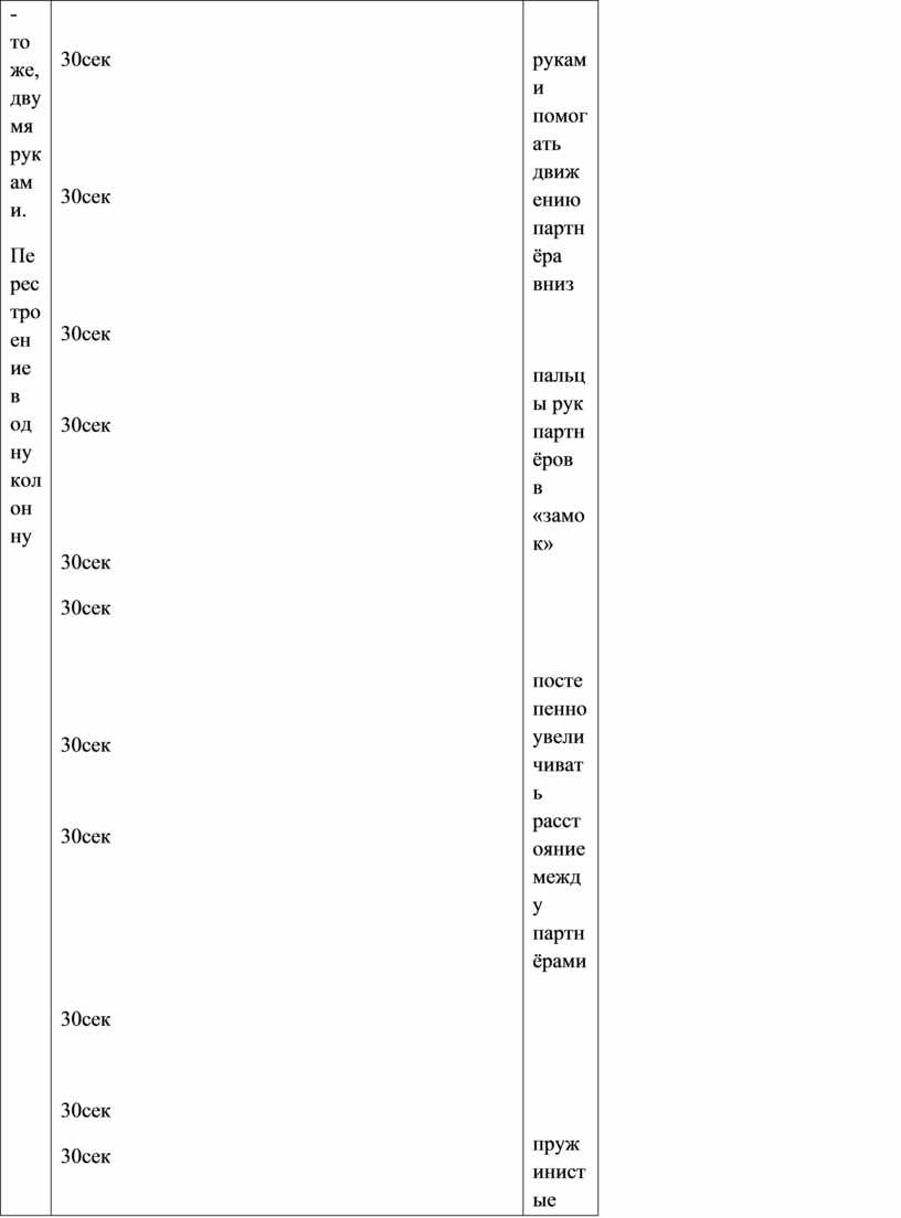 ОРУ в парах: - стойка, ноги врозь, лицом друг к другу, руки на плечи партнёра: пружинистые наклоны туловища вперёд; - стойка, ноги врозь, правая (левая) впереди, упереться руками, с силой сгибать и разгибать руки, преодолевая сопротивление партнёра; - стойка, ноги врозь, взяться за руки: повороты кругом, не отпуская рук, вправо и влево; - широкая стойка, спиной друг к другу, взяться за руки (руки в стороны), повороты туловища вправо, влево; - то же, наклоны туловища в стороны; - то же, взяться за руки в локтевом суставе: наклоны вперёд до горизонтального положения; - стойка, ноги врозь, лицом друг к другу, взяться за руки, приседания поочерёдно; - стойка, ноги врозь, лицом друг к другу, обхватить партнёра двумя руками за шею: преодолевая его сопротивление, стараться притянуть к себе; - стоя, боком друг к другу ноги врозь, взяться правой (левой) рукой: стараться перетянуть партнёра на свою сторону; - то же, двумя руками. Перестроение в одну колонну