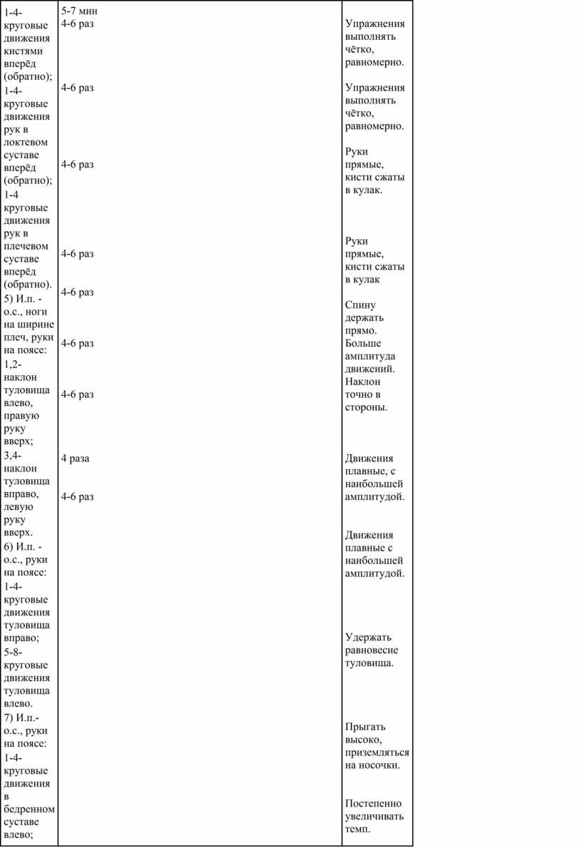 5. Комплекс общеразвивающих упражнений: 1) И.П. ноги на ширине плеч,руки на пояс 1-наклон головы вперёд 2-назад, 3-вправо 4-влево 2) И.п. - о.с., ноги врозь, руки на поясе; 1-4- круговые движения в правую сторону; 5-8- круговые движения головой в левую сторону. 3) И.п. - о.с., ноги на ширине плеч, правая рука вверх, левая вниз: 1,2- отведение рук назад (рывки); 3,4- смена положения рук. 4) И.п. - о.с., ноги на ширине плеч, руки прямо перед собой: 1-4- круговые движения кистями вперёд (обратно); 1-4- круговые движения рук в локтевом суставе вперёд (обратно); 1-4 круговые движения рук в плечевом суставе вперёд (обратно). 5) И.п. - о.с., ноги на ширине плеч, руки на поясе: 1,2- наклон туловища влево, правую руку вверх; 3,4- наклон туловища вправо, левую руку вверх. 6) И.п. - о.с., руки на поясе: 1-4- круговые движения туловища вправо; 5-8- круговые движения туловища влево. 7) И.п.- о.с., руки на поясе: 1-4- круговые движения в бедренном суставе влево; 5-8- круговые движения в бедренном суставе вправо. 8) И.п. - ноги шире плеч, присед на правую ногу, руки перед грудью: 1-4- перенос веса тела на левую ногу; 5-8- перенос веса тела на правую ногу. 9) И.п.- о.с.:1-4 прыжки на правой ноге; 1-4- прыжки на левой ноге; 1-4- прыжки на двух ногах. 10) И.п. -о.с.: 1,2,3- короткие прыжки на двух ногах; 4- прыжок с оборотом вокруг себя на 360º. |