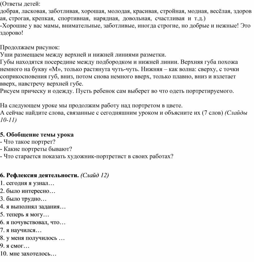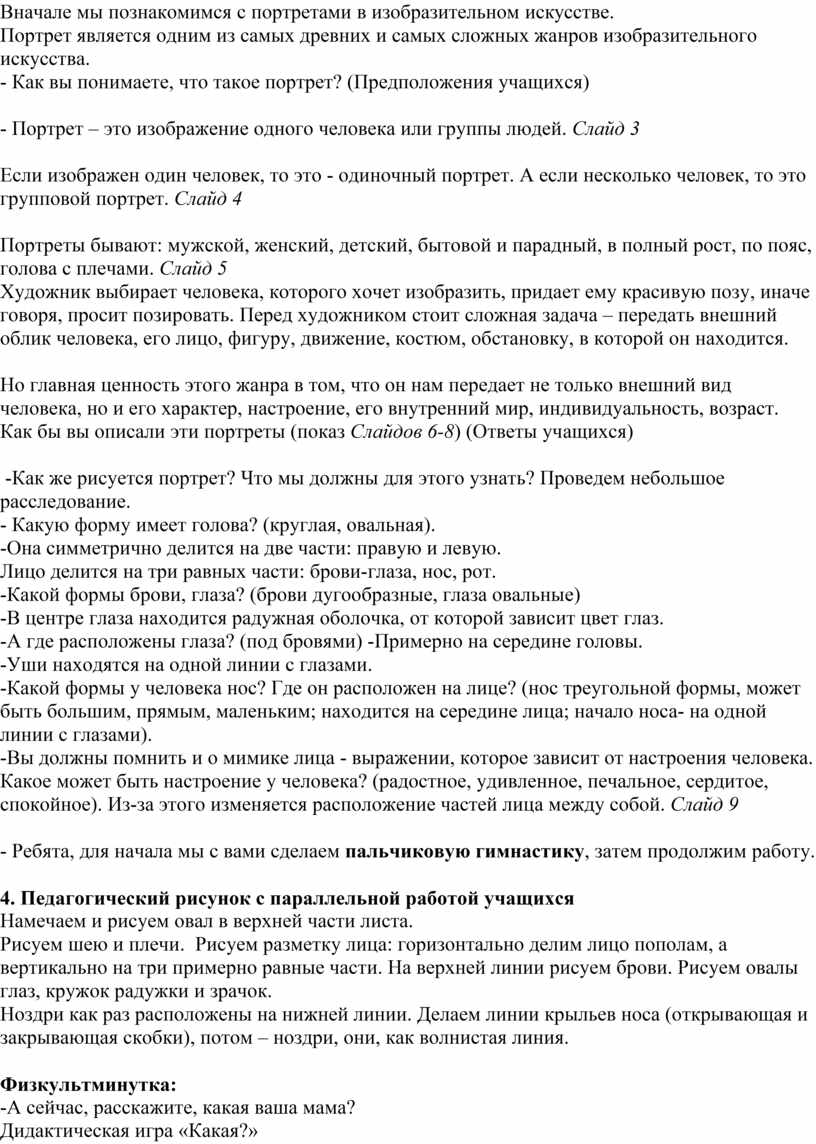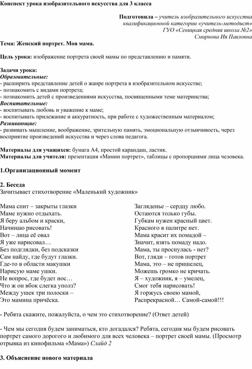 Цель урока: изображение портрета своей мамы по представлению и памяти.