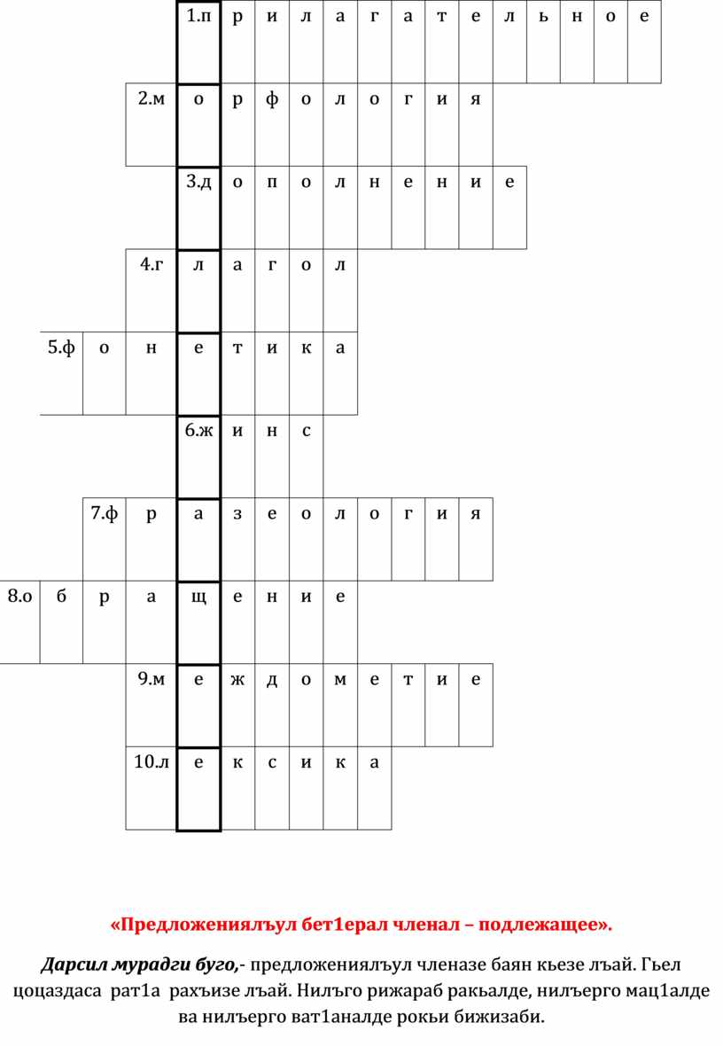 Дарсил тема: Предложениялъул бет1ерал членал. Подлежащее .