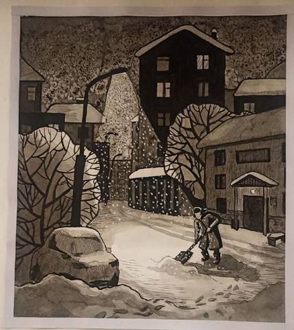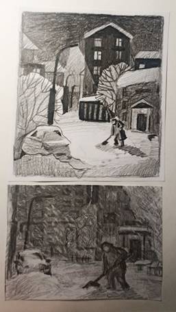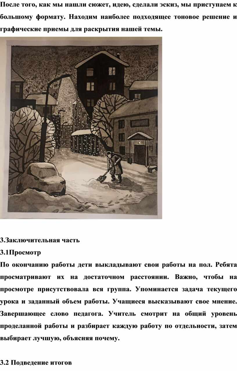 После того, как мы нашли сюжет, идею, сделали эскиз, мы приступаем к большому формату. Находим наиболее подходящее тоновое решение и графические приемы для раскрытия нашей темы.