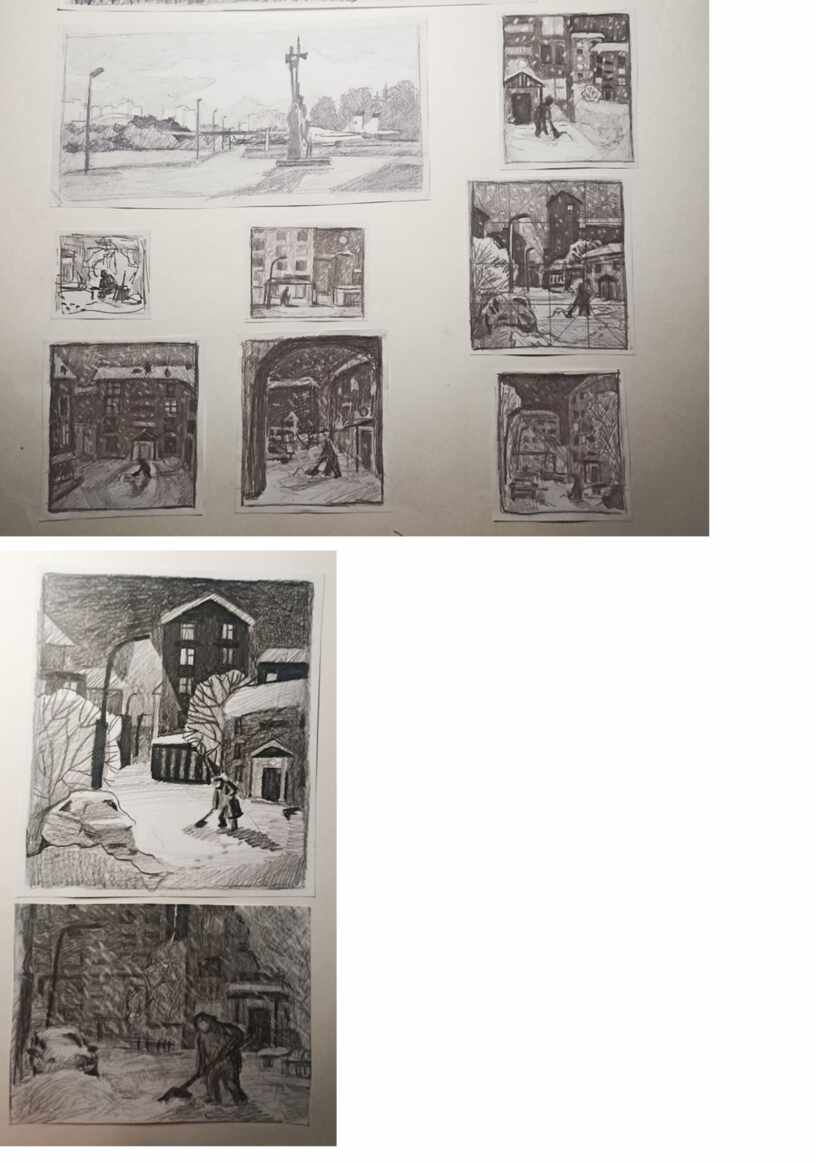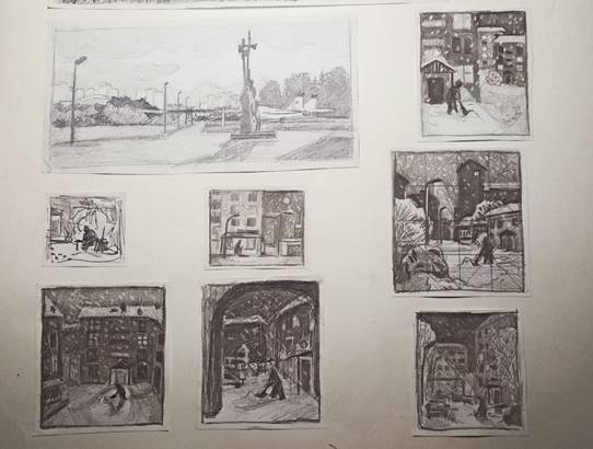 Как всегда большая работа начинается с поиска идеи, сюжета, темы. Мы ходим наблюдаем и ищем. Делаем натурные зарисовки и эскизы, ищем композицию.