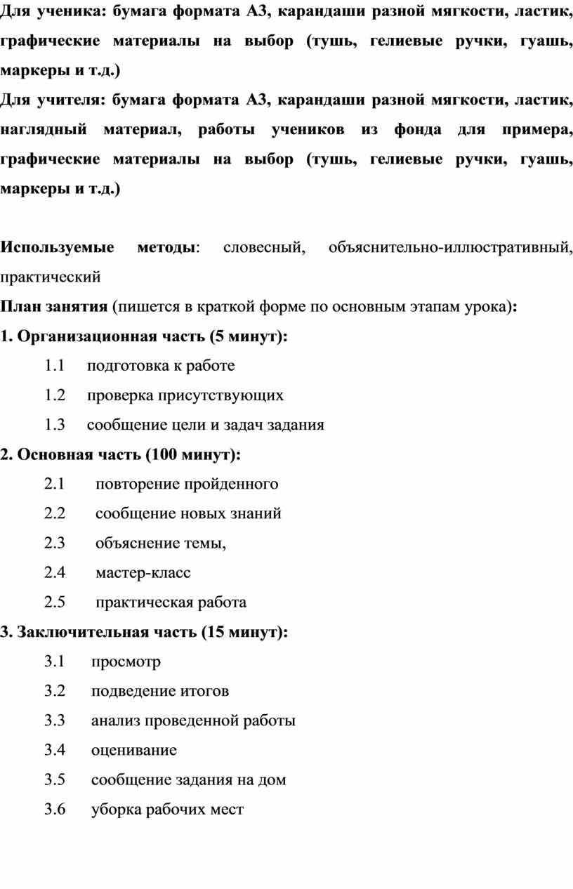 Для учителя: бумага формата А3, карандаши разной мягкости, ластик, наглядный материал, работы учеников из фонда для примера, графические материалы на выбор (тушь, гелиевые ручки, гуашь, маркеры и т.д.)