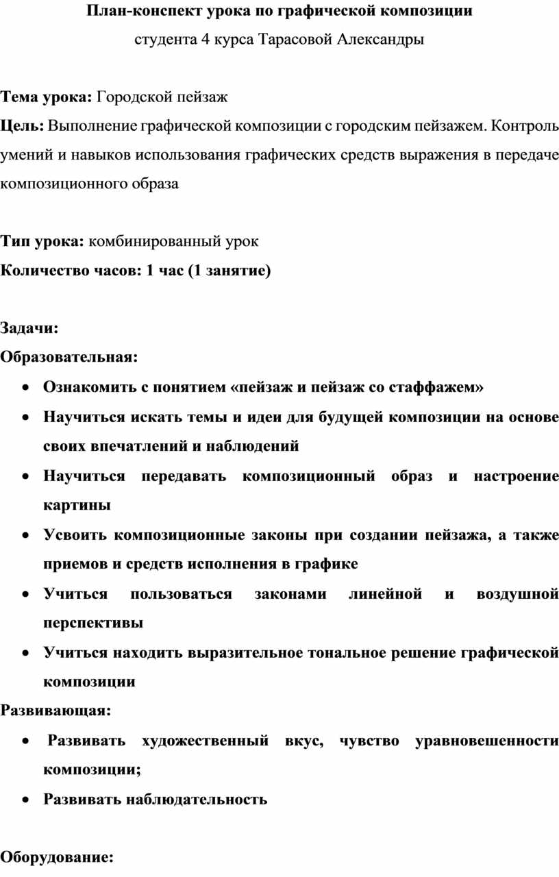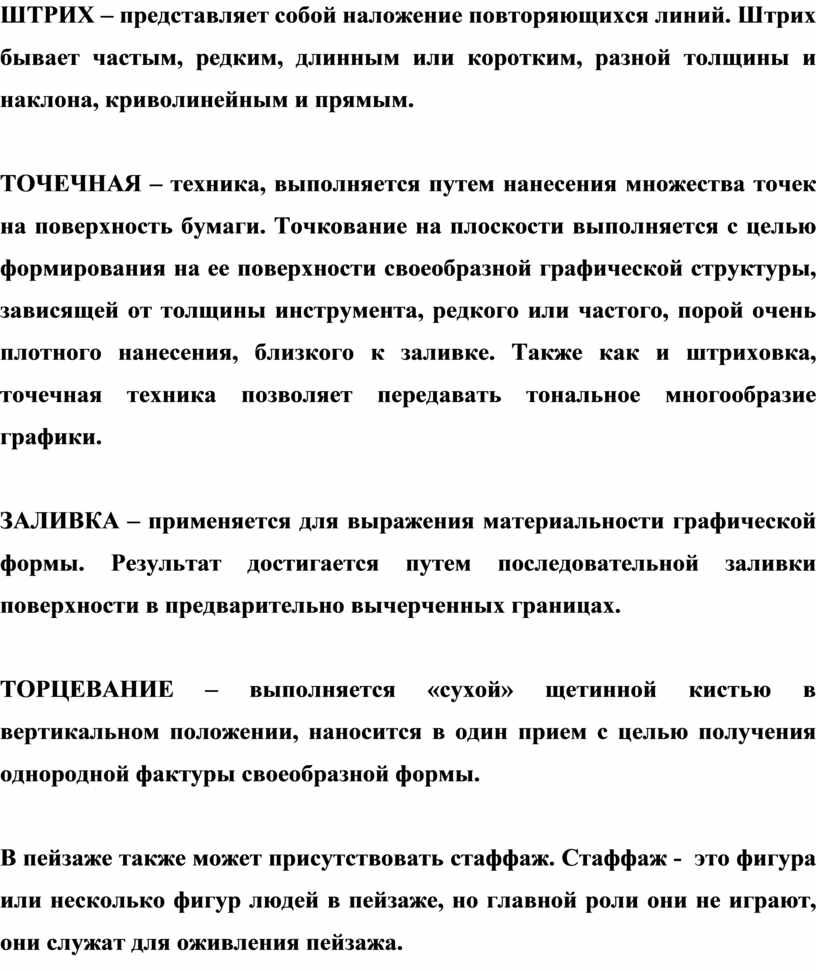 · Усвоить композиционные законы при создании пейзажа, а также приемов и средств исполнения в графике