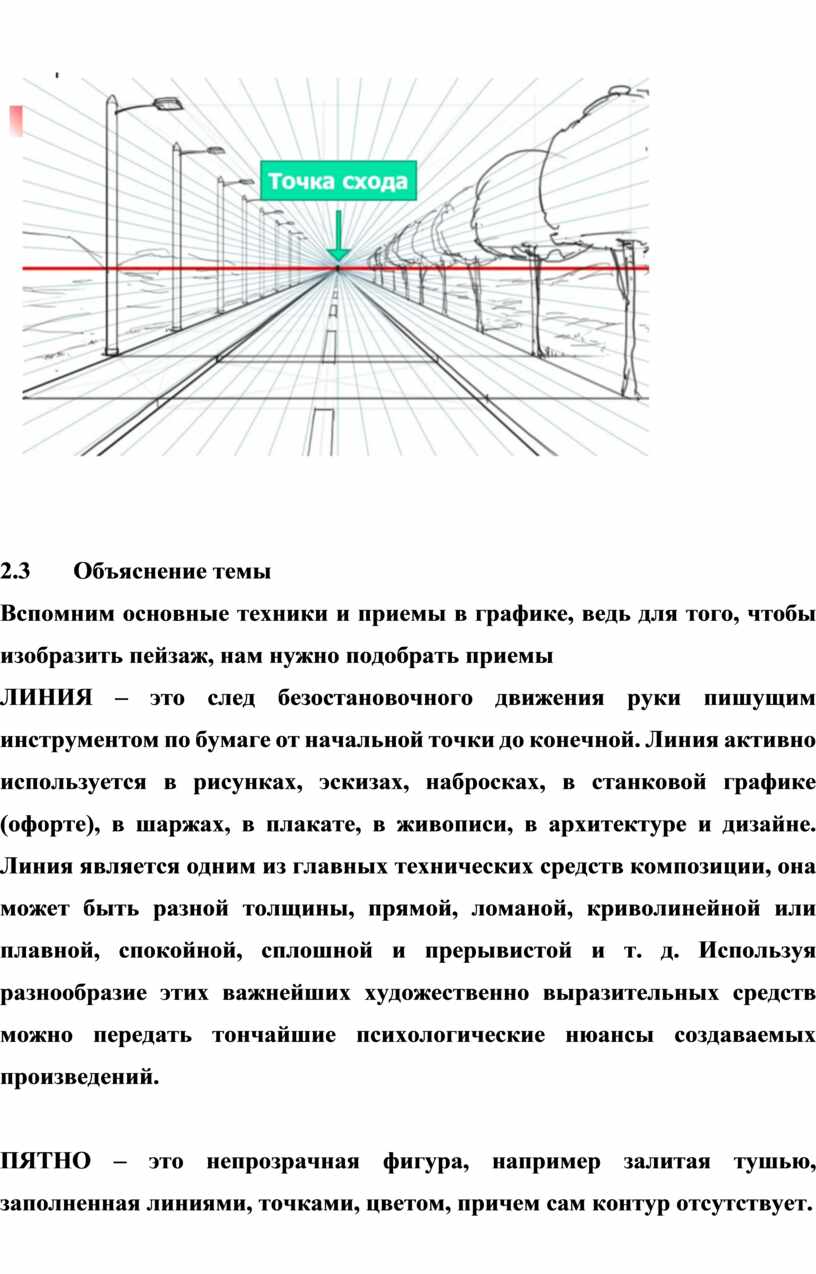 Вспомним основные техники и приемы в графике, ведь для того, чтобы изобразить пейзаж, нам нужно подобрать приемы