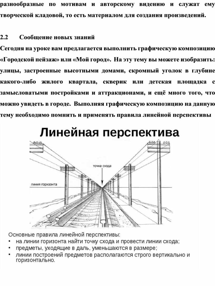 Сегодня на уроке вам предлагается выполнить графическую композицию «Городской пейзаж» или «Мой город». На эту тему вы можете изобразить: улицы, застроенные высотными домами, скромный уголок в глубине какого-либо жилого квартала, скверик или детская площадка с замысловатыми постройками и аттракционами, и ещё много того, что можно увидеть в городе. Выполняя графическую композицию на данную тему необходимо помнить и применять правила линейной перспективы