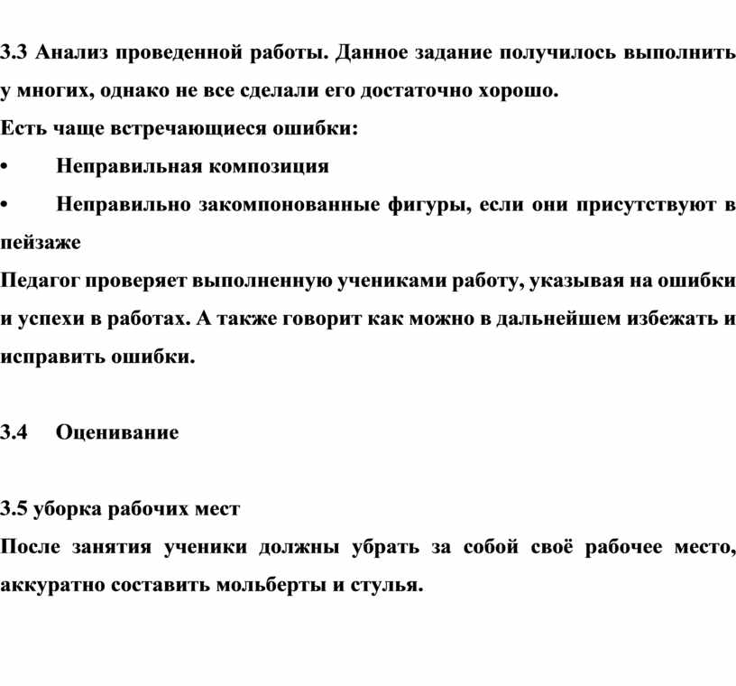 По окончанию работы дети выкладывают свои работы на пол. Ребята просматривают их на достаточном расстоянии. Важно, чтобы на просмотре присутствовала вся группа. Упоминается задача текущего урока и заданный объем работы. Учащиеся высказывают свое мнение. Завершающее слово педагога. Учитель смотрит на общий уровень проделанной работы и разбирает каждую работу по отдельности, затем выбирает лучшую, объясняя почему.