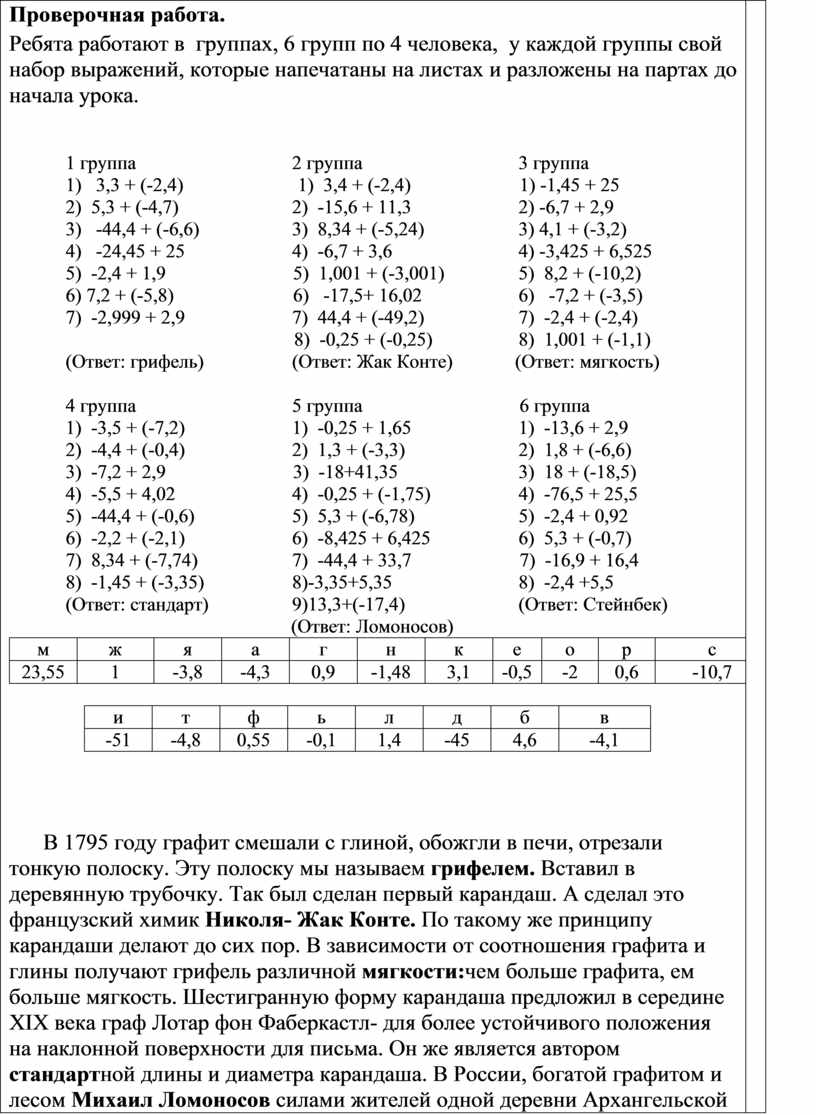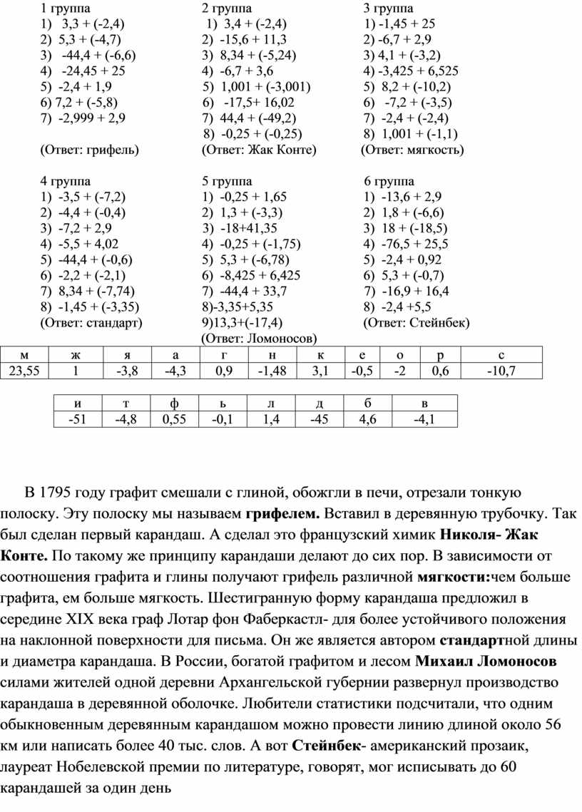 4 группа 5 группа 6 группа 1) -3,5 + (-7,2) 1) -0,25 + 1,65 1) -13,6 + 2,9 2) -4,4 + (-0,4) 2) 1,3 + (-3,3) 2) 1,8 + (-6,6) 3) -7,2 + 2,9 3) -18+41,35 3) 18 + (-18,5) 4) -5,5 + 4,02 4) -0,25 + (-1,75) 4) -76,5 + 25,5 5) -44,4 + (-0,6) 5) 5,3 + (-6,78) 5) -2,4 + 0,92 6) -2,2 + (-2,1) 6) -8,425 + 6,425 6) 5,3 + (-0,7) 7) 8,34 + (-7,74) 7) -44,4 + 33,7 7) -16,9 + 16,4 8) -1,45 + (-3,35) 8)-3,35+5,35 8) -2,4 +5,5 (Ответ: стандарт) 9)13,3+(-17,4) (Ответ: Стейнбек) (Ответ: Ломоносов)