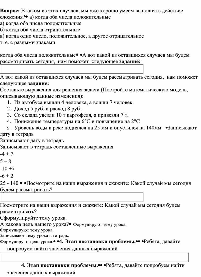 А вот какой из оставшихся случаев мы будем рассматривать сегодня, нам поможет следующее задание: Составьте выражения для решения задачи (Постройте математическую модель, описывающую данные изменения): 1. Из автобуса вышли 4 человека, а вошли 7 человек. 2. Доход 5 руб. и расход 8 руб . 3. Со склада увезли 10 т картофеля, а привезли 7 т. 4. Понижение температуры на 6°С и повышение на 2°С 5. Уровень воды в реке поднялся на 25 мм и опустился на 140мм |