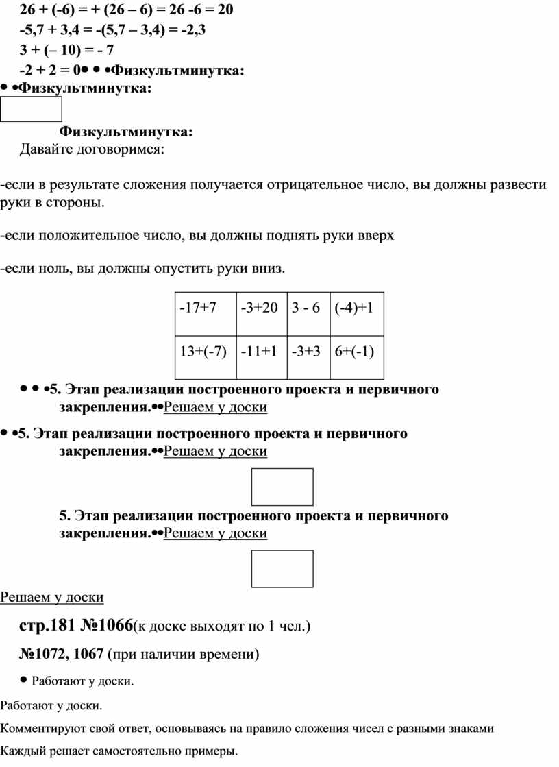 Физкультминутка: Давайте договоримся: -если в результате сложения получается отрицательное число, вы должны развести руки в стороны. -если положительное число, вы должны поднять руки вверх -если ноль, вы должны опустить руки вниз.