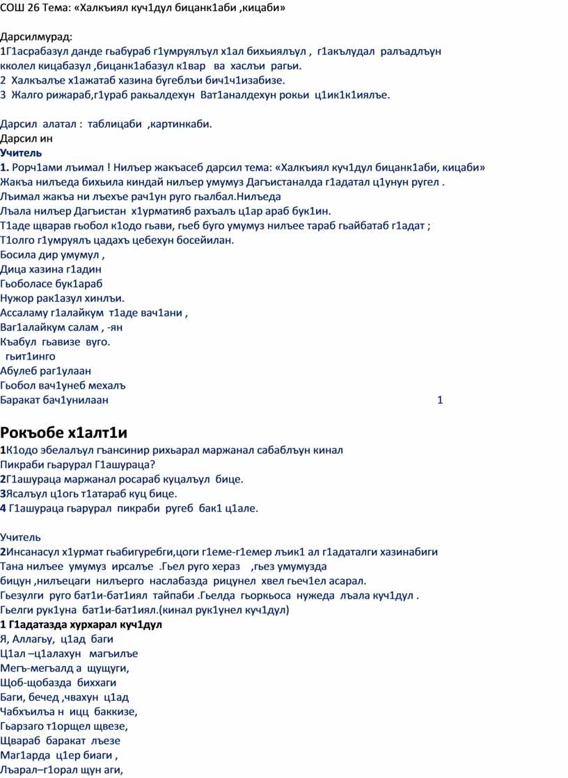 СОШ 26 Тема: «Халкъиял куч1дул бицанк1аби ,кицаби»