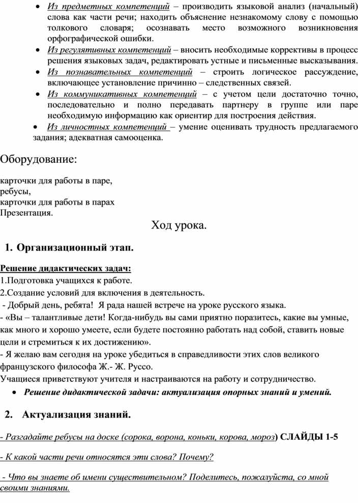· Из предметных компетенций – производить языковой анализ (начальный) слова как части речи; находить объяснение незнакомому слову с помощью толкового словаря; осознавать место возможного возникновения орфографической ошибки.