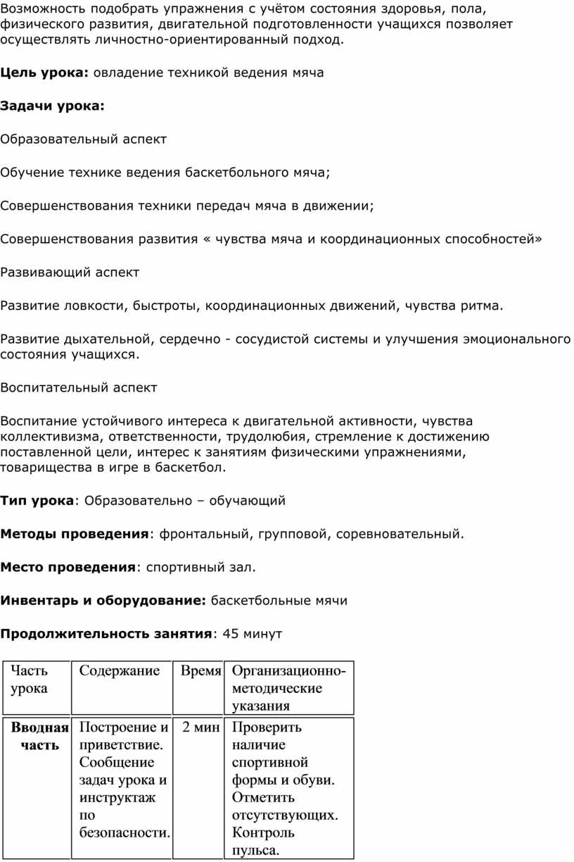 План-конспект урока по теме: "Формирование навыков техники передачи мяча. Освоение техники ведения мяча различными способами"