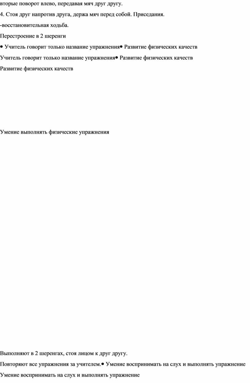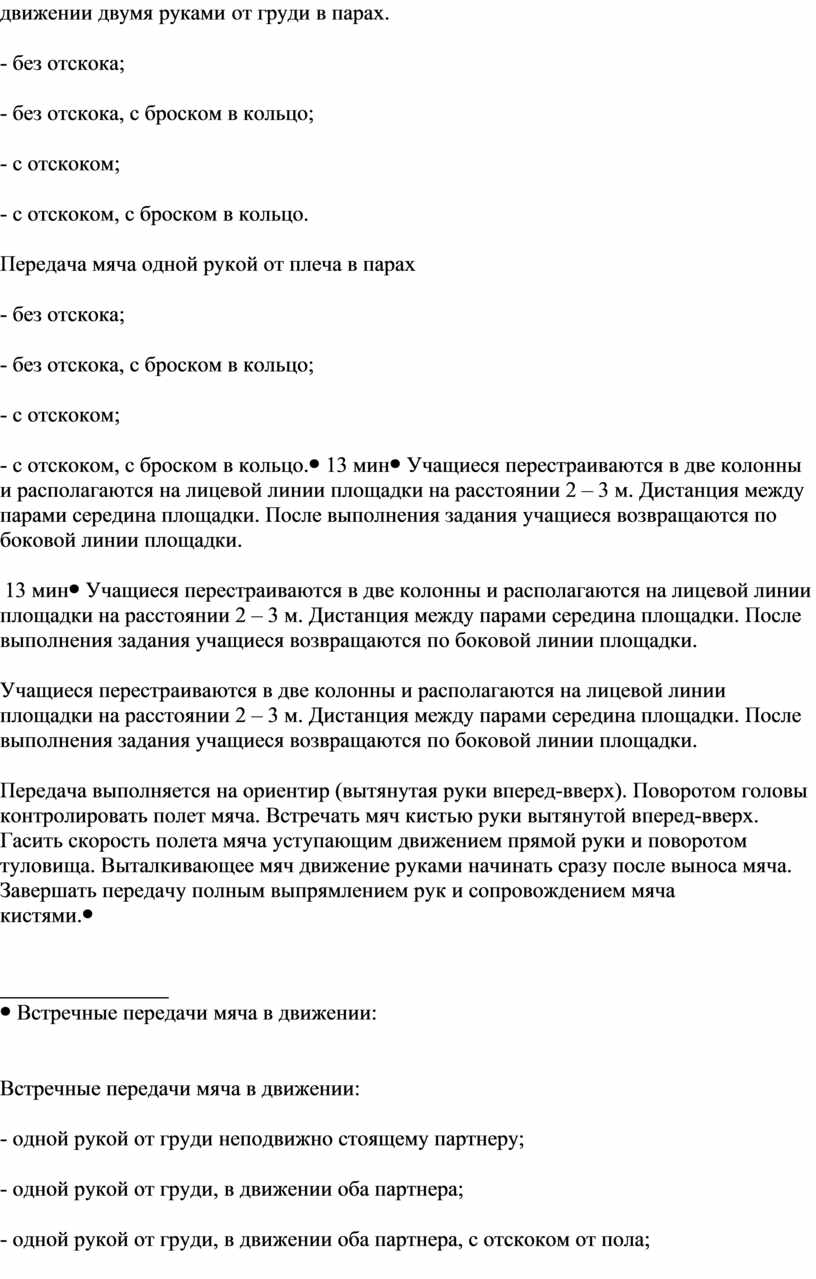 Учащиеся перестраиваются в две колонны и располагаются на лицевой линии площадки на расстоянии 2 – 3 м. Дистанция между парами середина площадки. После выполнения задания учащиеся возвращаются по боковой линии площадки.