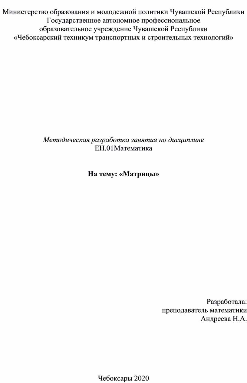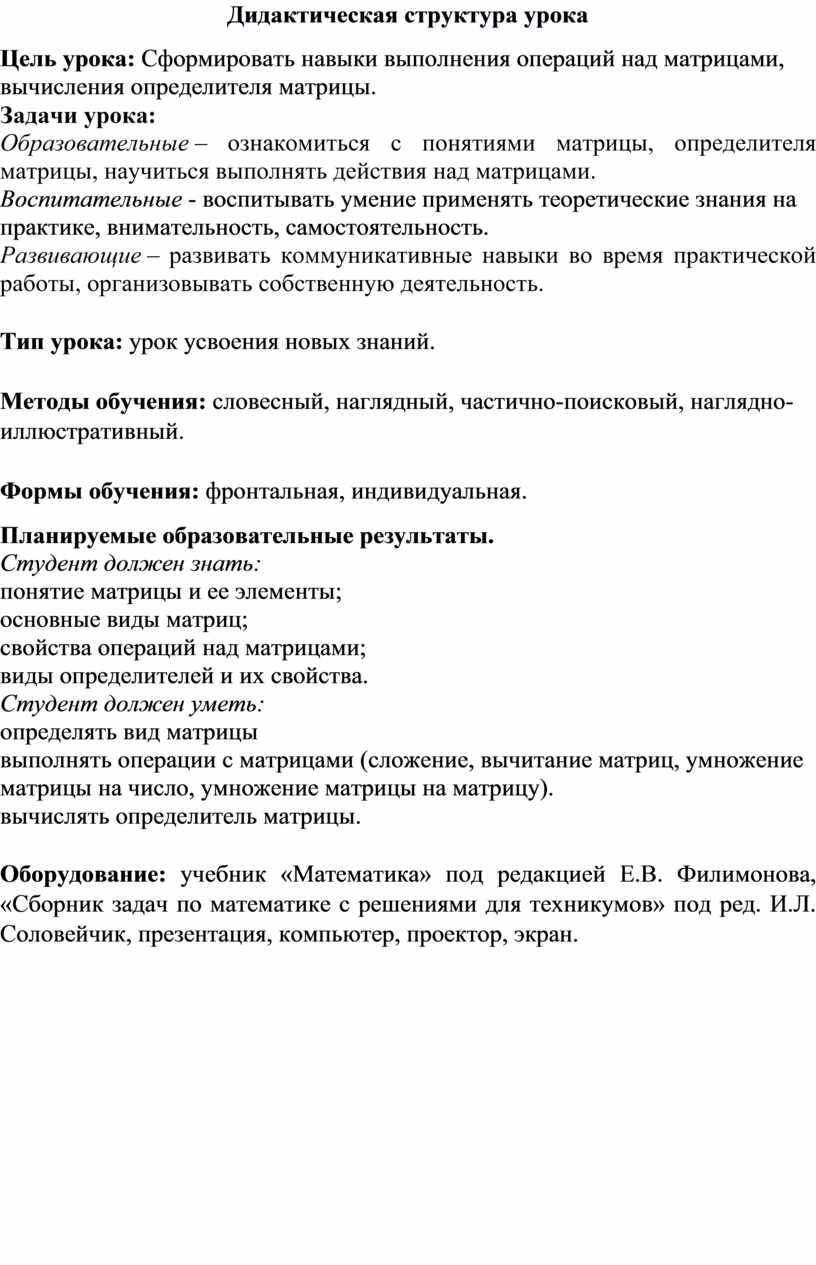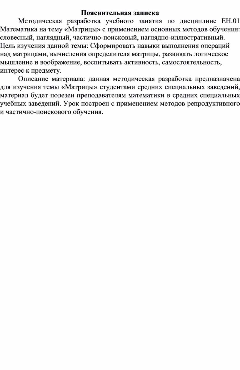 Методическая разработка учебного занятия по дисциплине ЕН.01 Математика на тему «Матрицы» с применением основных методов обучения: словесный, наглядный, частично-поисковый, наглядно-иллюстративный.
