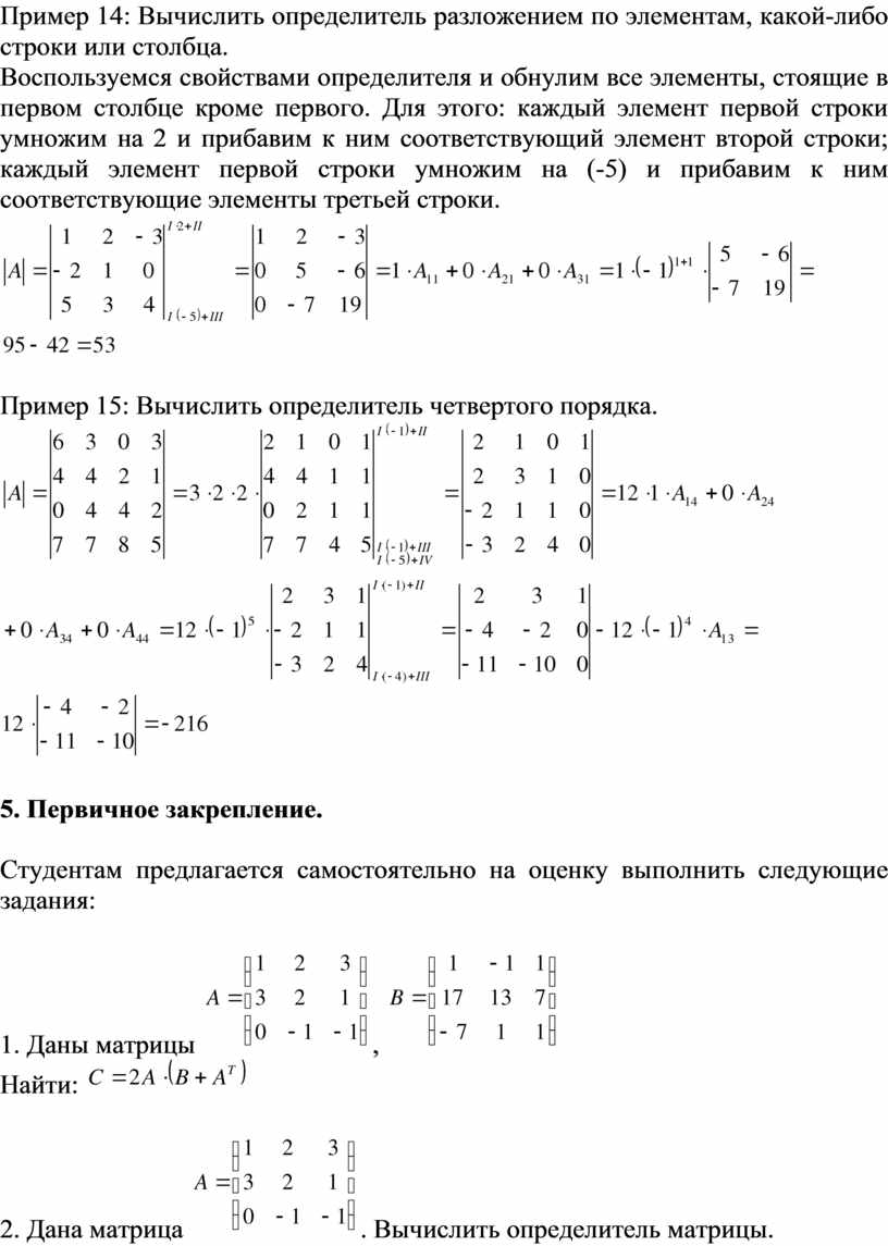Пример 14: Вычислить определитель разложением по элементам, какой-либо строки или столбца.
