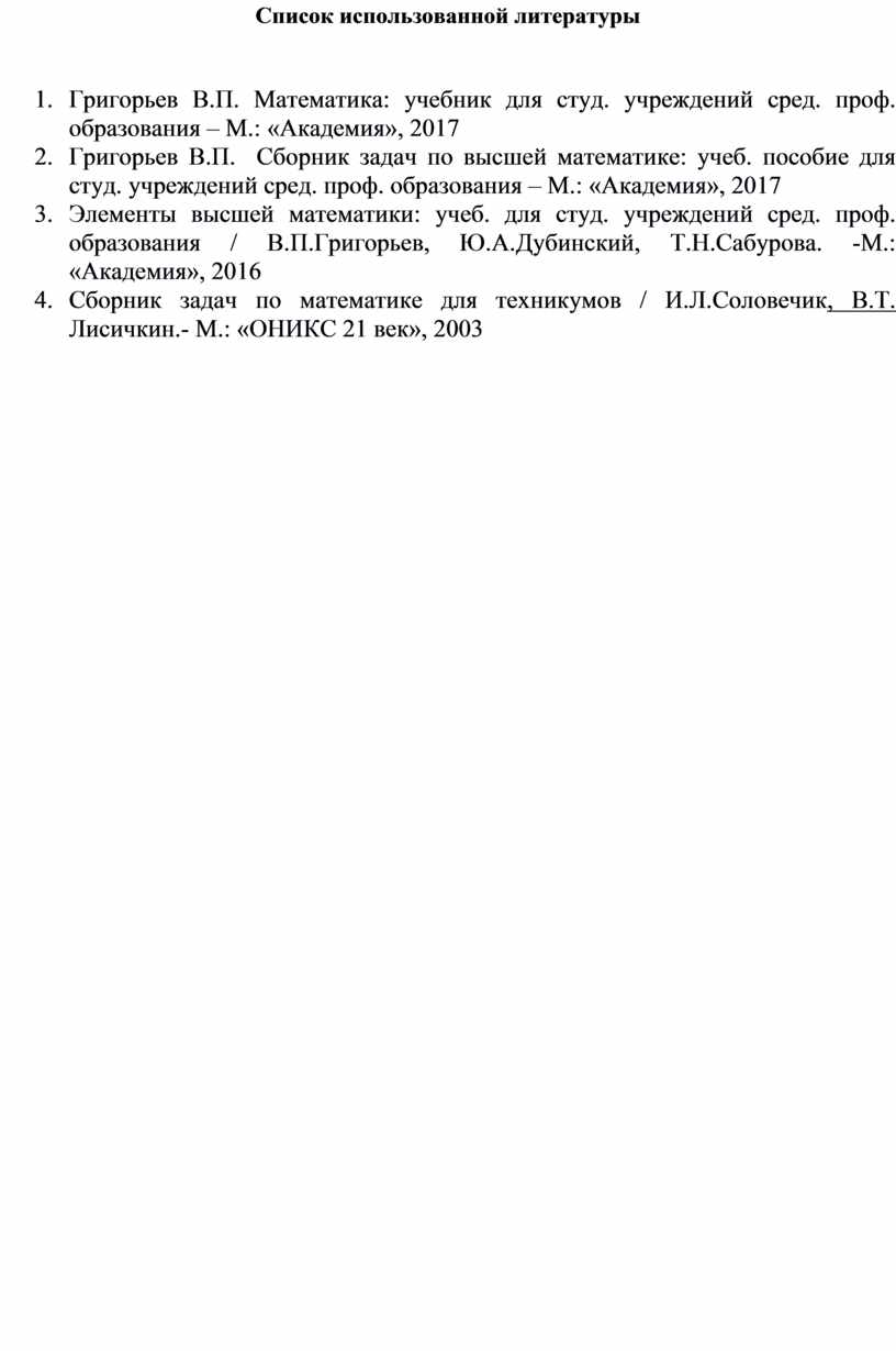 1. Григорьев В.П. Математика: учебник для студ. учреждений сред. проф. образования – М.: «Академия», 2017