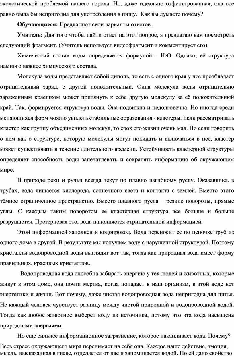 Учитель: Вы правы. Вода – самое привычное вещество на Земле. Она сопровождает каждое мгновение нашей жизни. Но, знаем ли мы, какую тайну хранит в себе этот оксид, откуда он пришел, кто и зачем одарил им нашу планету – единственным во всей вселенной. Этот оксид подарил нам жизнь, и позволяет жить, невзирая на наше потребительское отношение к нему.