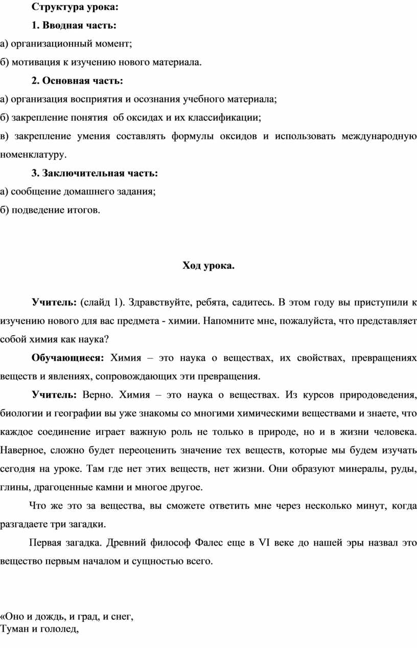 Учитель: (слайд 1). Здравствуйте, ребята, садитесь. В этом году вы приступили к изучению нового для вас предмета - химии. Напомните мне, пожалуйста, что представляет собой химия как наука?