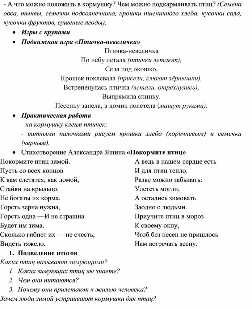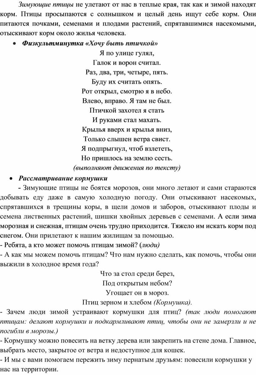 Задачи: формировать представления о зимующих птицах родного края, учить узнавать по внешнему виду и называть их; развивать познавательный интерес к миру природы; формировать желание заботиться о птицах в зимний период (развешивать кормушки, подкармливать птиц); формировать навык аккуратной работы с клеем, красками; воспитывать бережное отношение к птицам, эмоциональную отзывчивость.