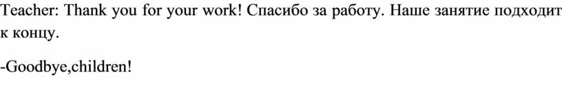 Teacher: Thank you for your work! Спасибо за работу. Наше занятие подходит к концу.