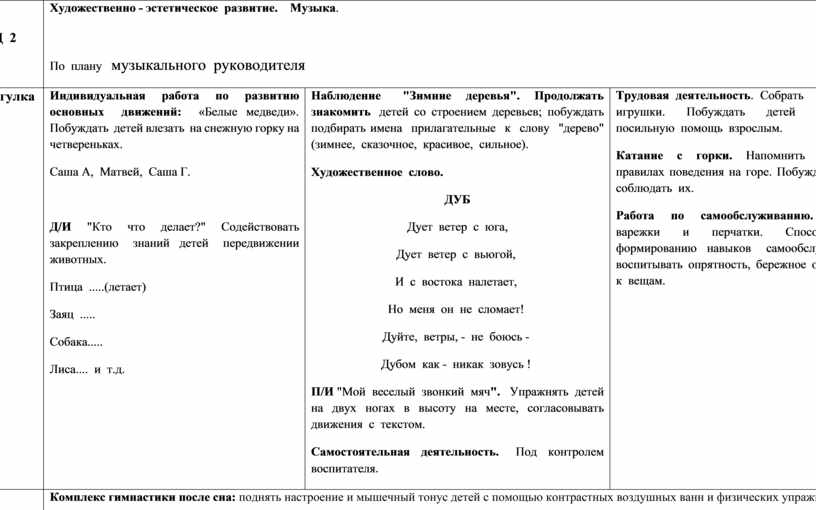 Наблюдение "Зимние деревья". Продолжать знакомить детей со строением деревьев; побуждать подбирать имена прилагательные к слову "дерево" (зимнее, сказочное, красивое, сильное). Художественное слово. ДУБ Дует ветер с юга, Дует ветер с вьюгой, И с востока налетает, Но меня он не сломает! Дуйте, ветры, - не боюсь - Дубом как - никак зовусь ! П/И "Мой веселый звонкий мяч". Упражнять детей на двух ногах в высоту на месте, согласовывать движения с текстом. Самостоятельная деятельность. Под контролем воспитателя. |