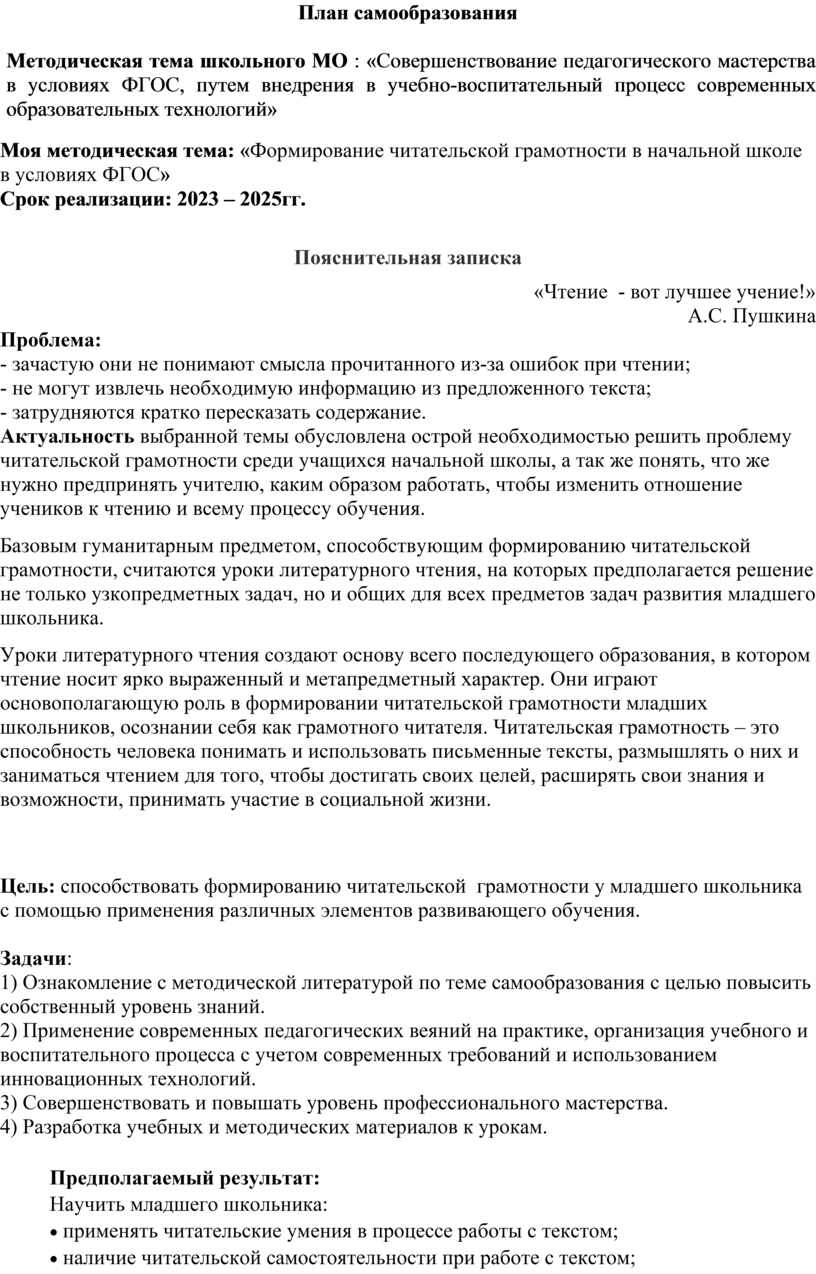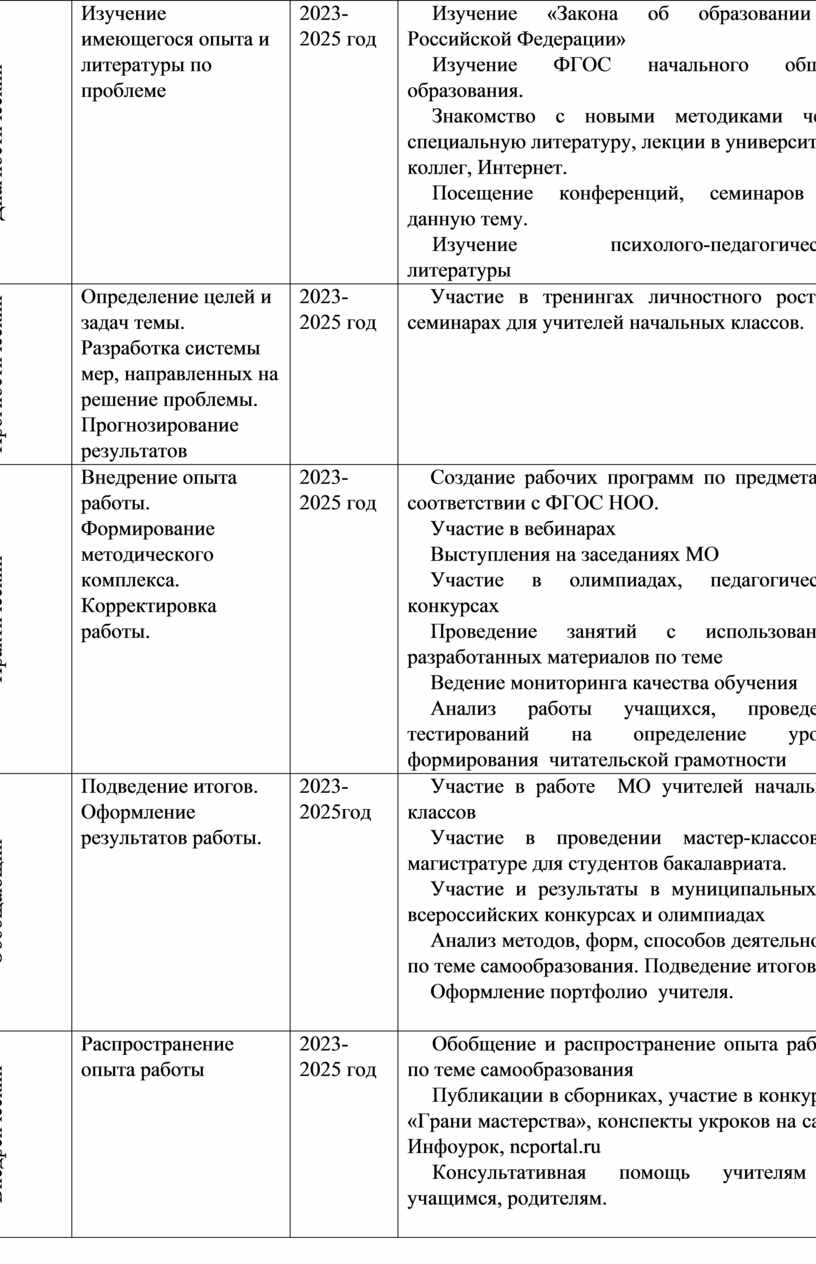 Создание рабочих программ по предметам в соответствии с ФГОС НОО. Участие в вебинарах Выступления на заседаниях МО Участие в олимпиадах, педагогических конкурсах Проведение занятий с использованием разработанных материалов по теме Ведение мониторинга качества обучения Анализ работы учащихся, проведение тестирований на определение уровня формирования читательской грамотности |