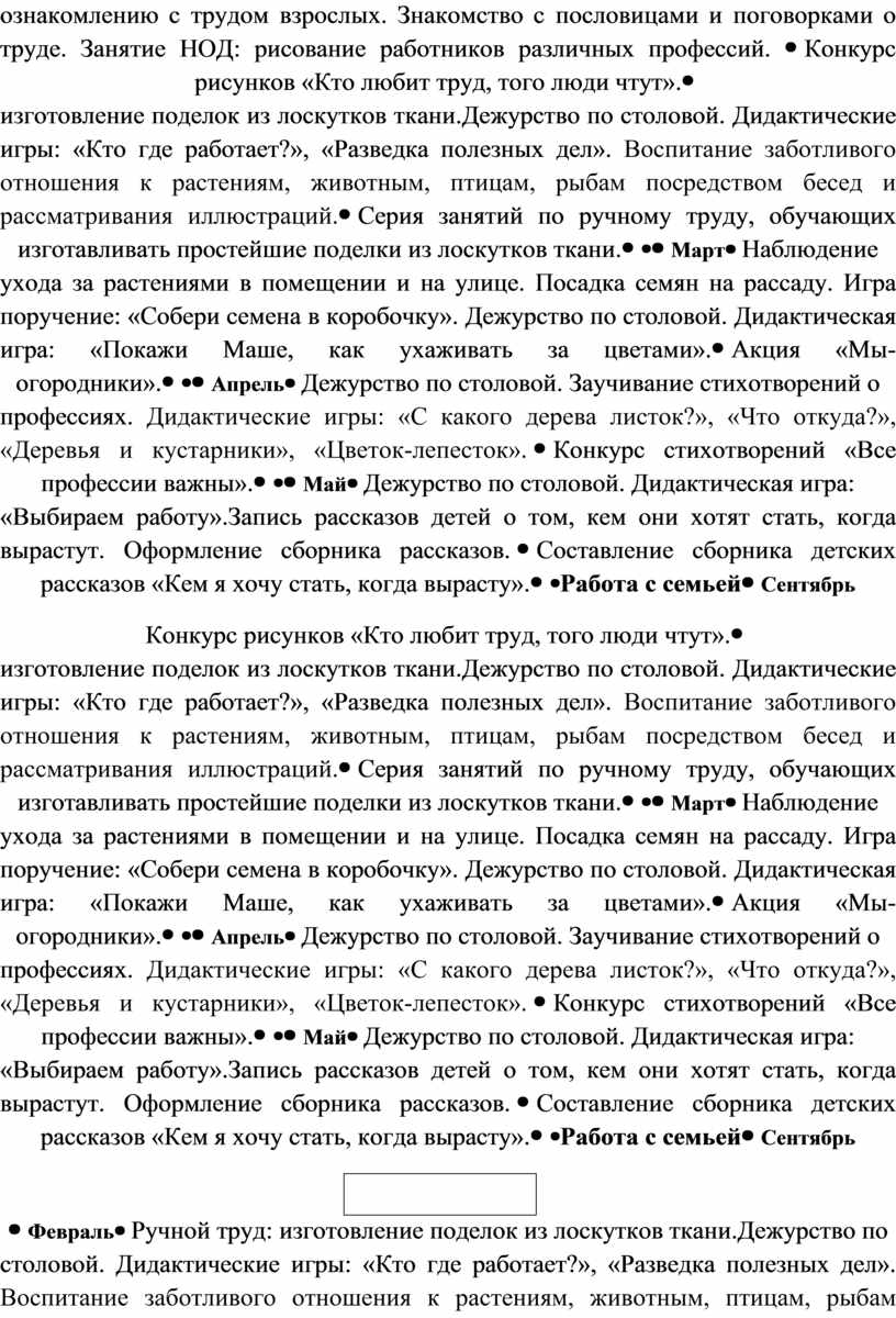 Ручной труд: изготовление поделок из лоскутков ткани.Дежурство по столовой. Дидактические игры: «Кто где работает?», «Разведка полезных дел». Воспитание заботливого отношения к растениям, животным, птицам, рыбам посредством бесед и рассматривания иллюстраций. |