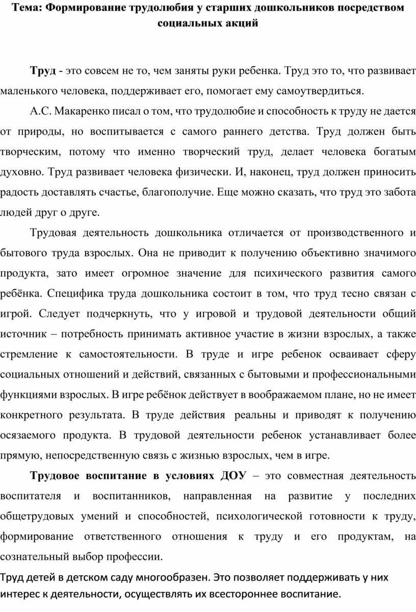 на тему: «Формирование трудолюбия у старших дошкольников посредством социальных акций»