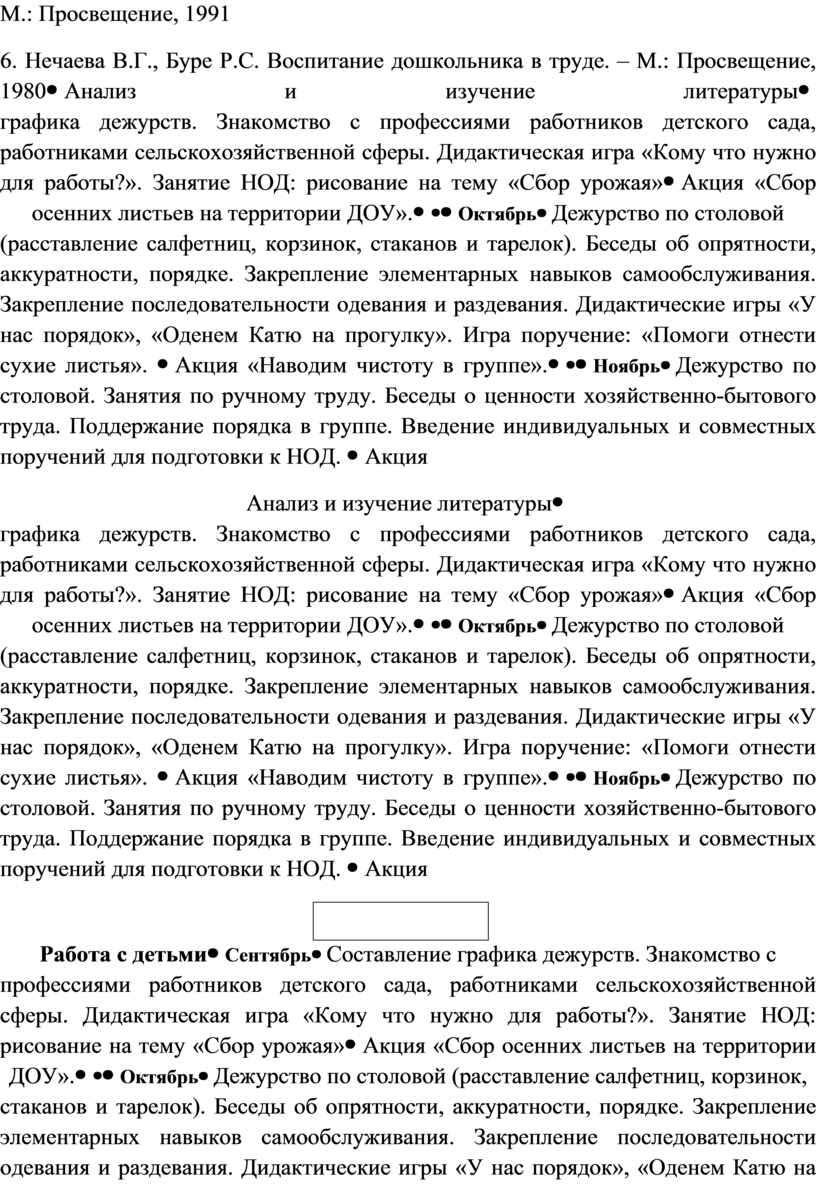 1. Буре Р.С. Организация труда детей и методика руководства // Нравственно-трудовое воспитание детей в детском саду. - М.: Просвещение, 1987. 2. Година Г.Н. Воспитание положительного отношения к труду // Воспитание нравственных чувств у старших дошкольников / Под ред. А.М. Виноградовой. М.: Просвещение, 1998 3. Куцакова Л.В. Творим и мастерим. Ручной труд в детском саду и дома. – Мозаика-Синтез, Москва 2010. 4. Куцакова Л.В. «Трудовое воспитание в детском саду» - Мозаика-Синтез, Москва 2014. 5. Маркова Т.А. Воспитание трудолюбия у дошкольников. – М.: Просвещение, 1991 6. Нечаева В.Г., Буре Р.С. Воспитание дошкольника в труде. – М.: Просвещение, 1980 |