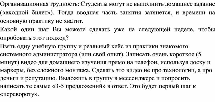 Взять одну учебную группу и реальный кейс из практики знакомого системного администратора (или свой опыт). Записать очень короткое (5 минут) видео для домашнего изучения прямо на телефон, используя доску и маркеры, без сложного монтажа. Сделать это видео не про технологии, а про деньги и репутацию. Выложить в группу в мессенджере и попросить написать те самые «3-5 предложений» в ответ. Это будет первый шаг к «перевороту».