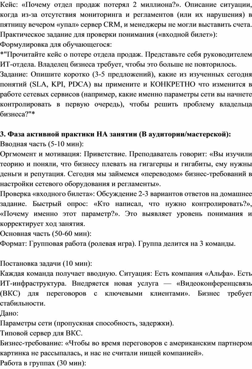 Оргмомент и мотивация: Приветствие. Преподаватель говорит: «Вы изучили теорию и поняли, что бизнесу плевать на гигагерцы и гигабиты, ему нужны деньги и репутация. Сегодня мы займемся «переводом» бизнес-требований в настройки сетевого оборудования и регламенты».