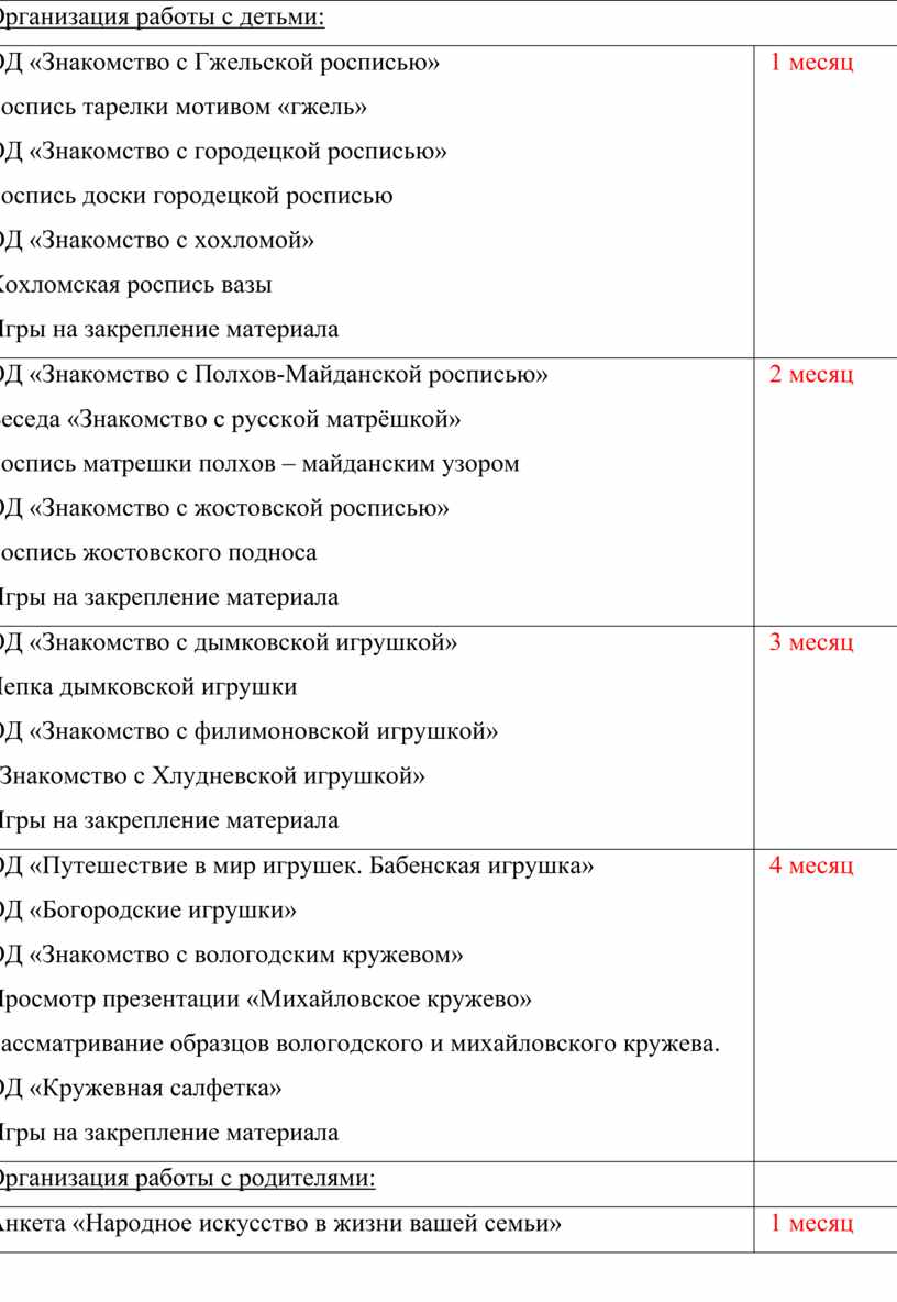ОД «Путешествие в мир игрушек. Бабенская игрушка» ОД «Богородские игрушки» ОД «Знакомство с вологодским кружевом» Просмотр презентации «Михайловское кружево» Рассматривание образцов вологодского и михайловского кружева. ОД «Кружевная салфетка» Игры на закрепление материала |