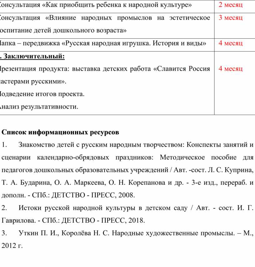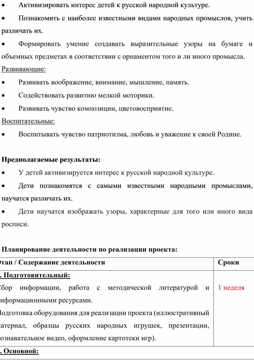 1. Подготовительный: Сбор информации, работа с методической литературой и информационными ресурсами. Подготовка оборудования для реализации проекта (иллюстративный материал, образцы русских народных игрушек, презентации, познавательное видео, оформление картотеки игр). |