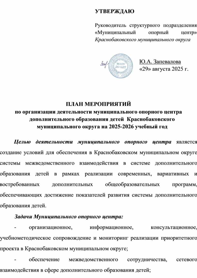 по организации деятельности муниципального опорного центра дополнительного образования детей Краснобаковского муниципального округа на 2025-2026 учебный год
