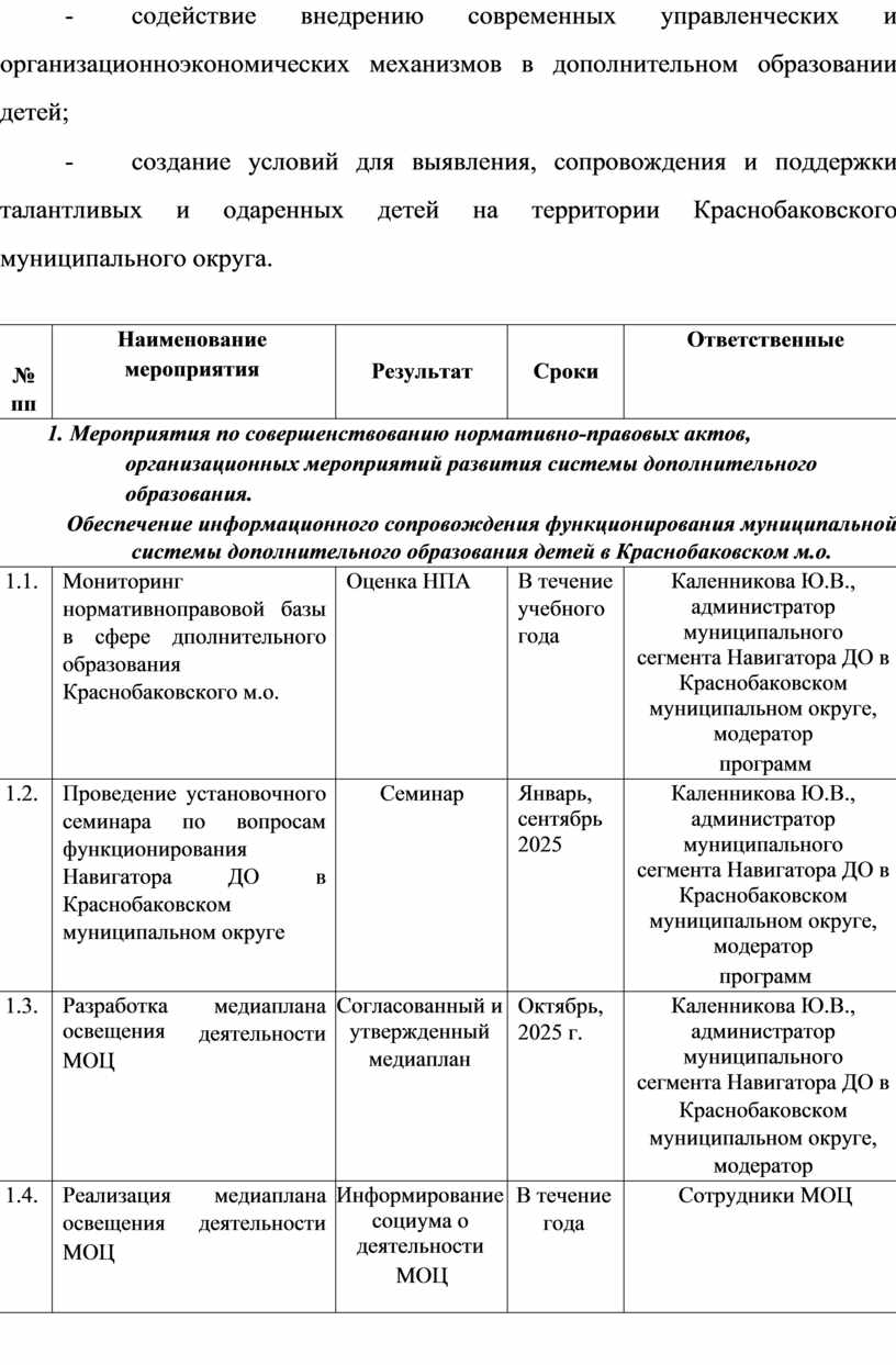 1. Мероприятия по совершенствованию нормативно-правовых актов, организационных мероприятий развития системы дополнительного образования. Обеспечение информационного сопровождения функционирования муниципальной системы дополнительного образования детей в Краснобаковском м.о. |