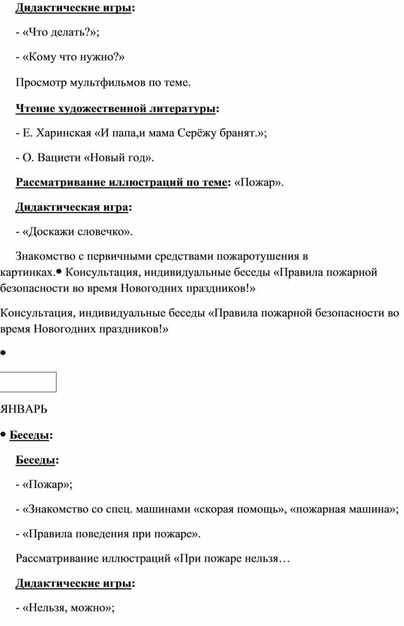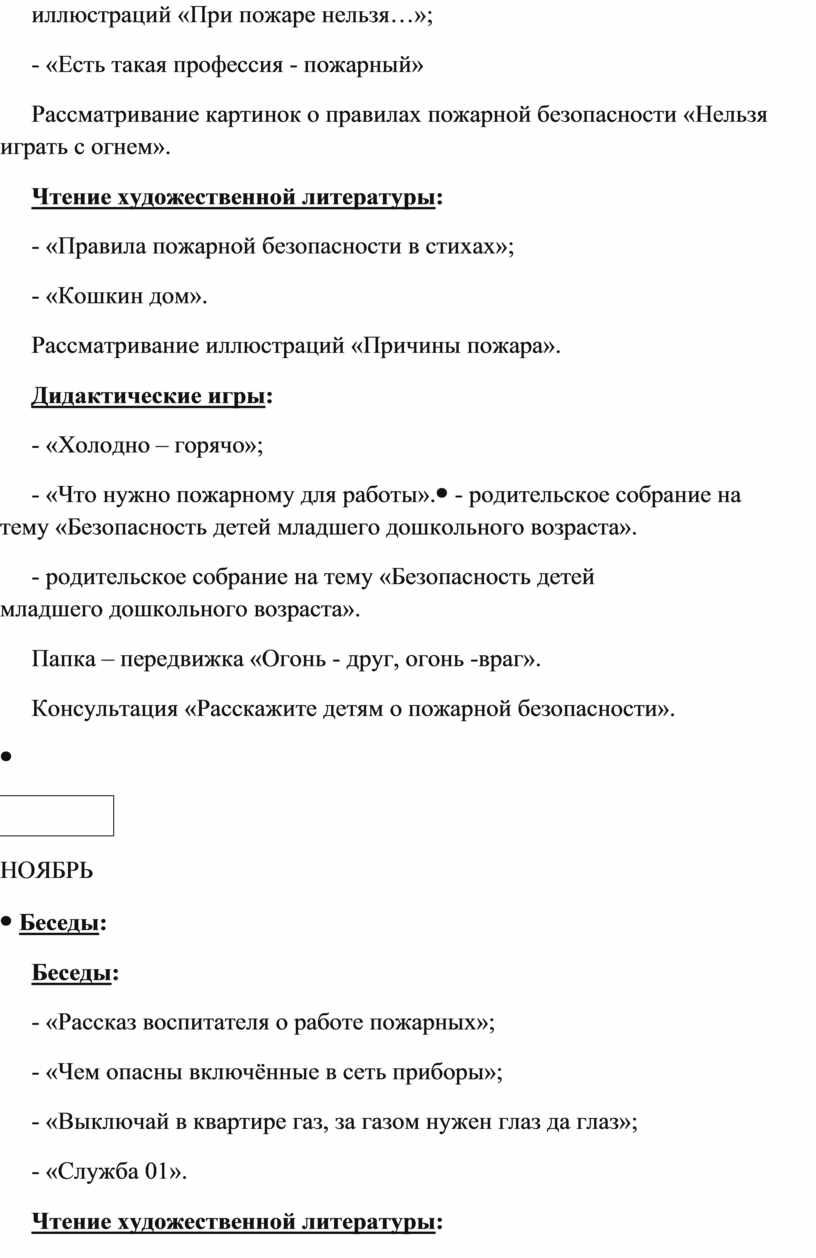 Беседы: - «Рассказ воспитателя о работе пожарных»; - «Чем опасны включённые в сеть приборы»; - «Выключай в квартире газ, за газом нужен глаз да глаз»; - «Служба 01». Чтение художественной литературы: - чтение стихотворений на тему «Соблюдай правила пожарной безопасности». Рассматривание иллюстраций с изображением пожарного. - «Все о пожаре!» Экскурсия по детскому саду: «Знакомство с пожарным щитом». Опытно-исследовательская деятельность: «Чем можно потушить пожар». |
