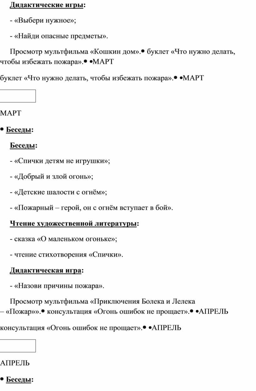 Беседы: - «Спички детям не игрушки»; - «Добрый и злой огонь»; - «Детские шалости с огнём»; - «Пожарный – герой, он с огнём вступает в бой». Чтение художественной литературы: - сказка «О маленьком огоньке»; - чтение стихотворения «Спички». Дидактическая игра: - «Назови причины пожара». Просмотр мультфильма «Приключения Болека и Лелека – «Пожар»». |