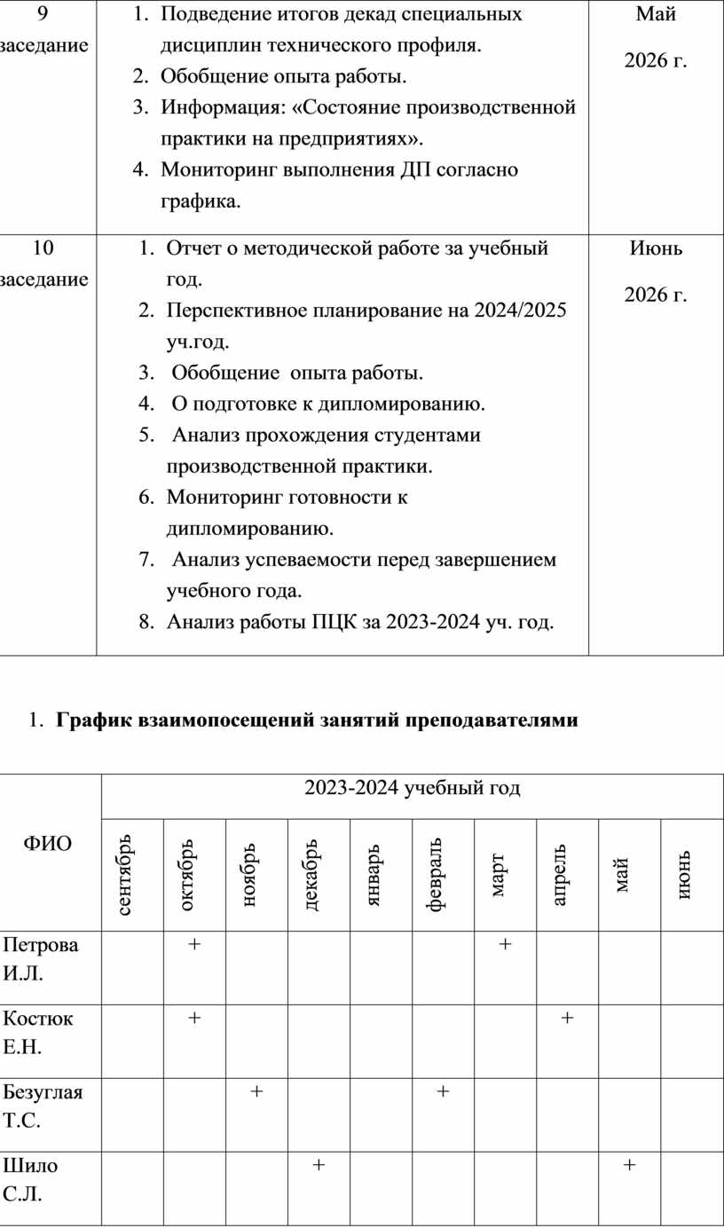 1. Отчет о методической работе за учебный год. 2. Перспективное планирование на 2024/2025 уч.год. 3. Обобщение опыта работы. 4. О подготовке к дипломированию. 5. Анализ прохождения студентами производственной практики. 6. Мониторинг готовности к дипломированию. 7. Анализ успеваемости перед завершением учебного года. 8. Анализ работы ПЦК за 2023-2024 уч. год. |